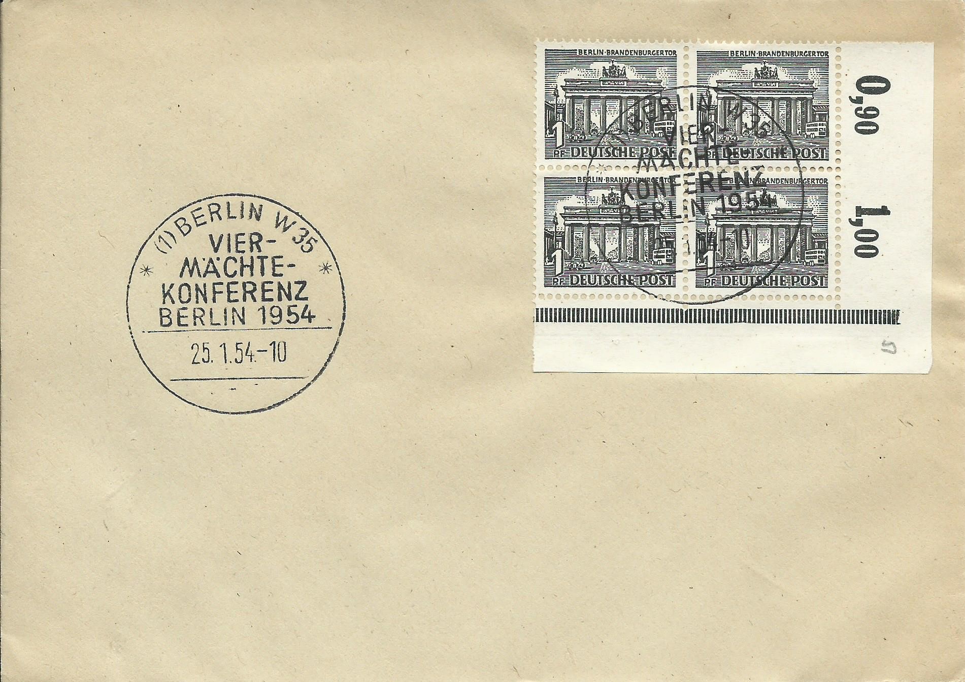 von der Serie Berliner Bauten ist die Marke zu 1 Pf der kleinste Wert. Hier kann ich einen Eck-4-er-Block aus der rechten oberen Bogenecke mit Sonderstempel Berlin W35 „4-Mächte-Konferenz“ vom 25.1.54 auf einer Stempelvorlage zeigen: