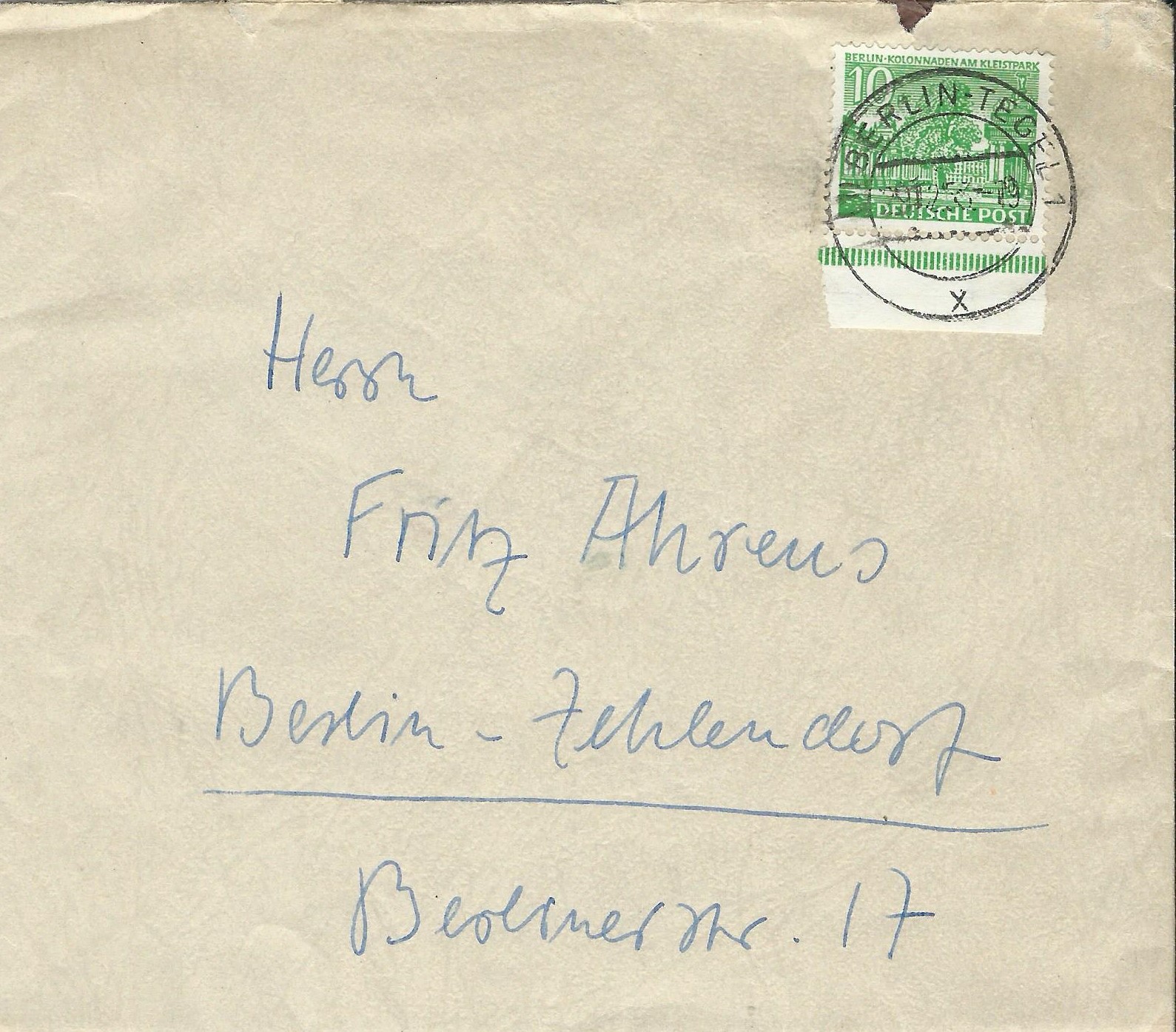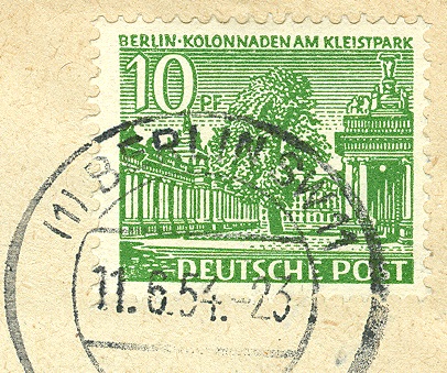 Hier einmal eine gestempelte lose Marke vom Unterrand. Auffällig ist die Unterbrechung der Strichelleiste. Normalerweise sind die Strichelleisten durchgehend, es sind aber von verschiedenen Marken im Plattendruck sowohl von Bund als auch Berlin Unterbrechungen bekannt. Daran kann man einzelne Teilauflagen bestimmen, sofern man komplette Bogen als Abbildung vorliegen hat.