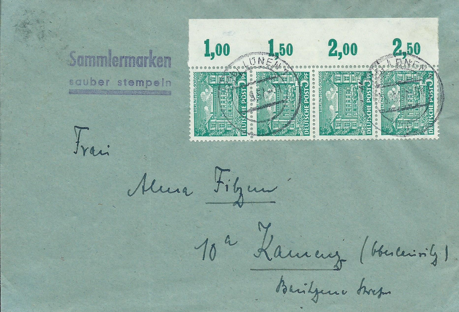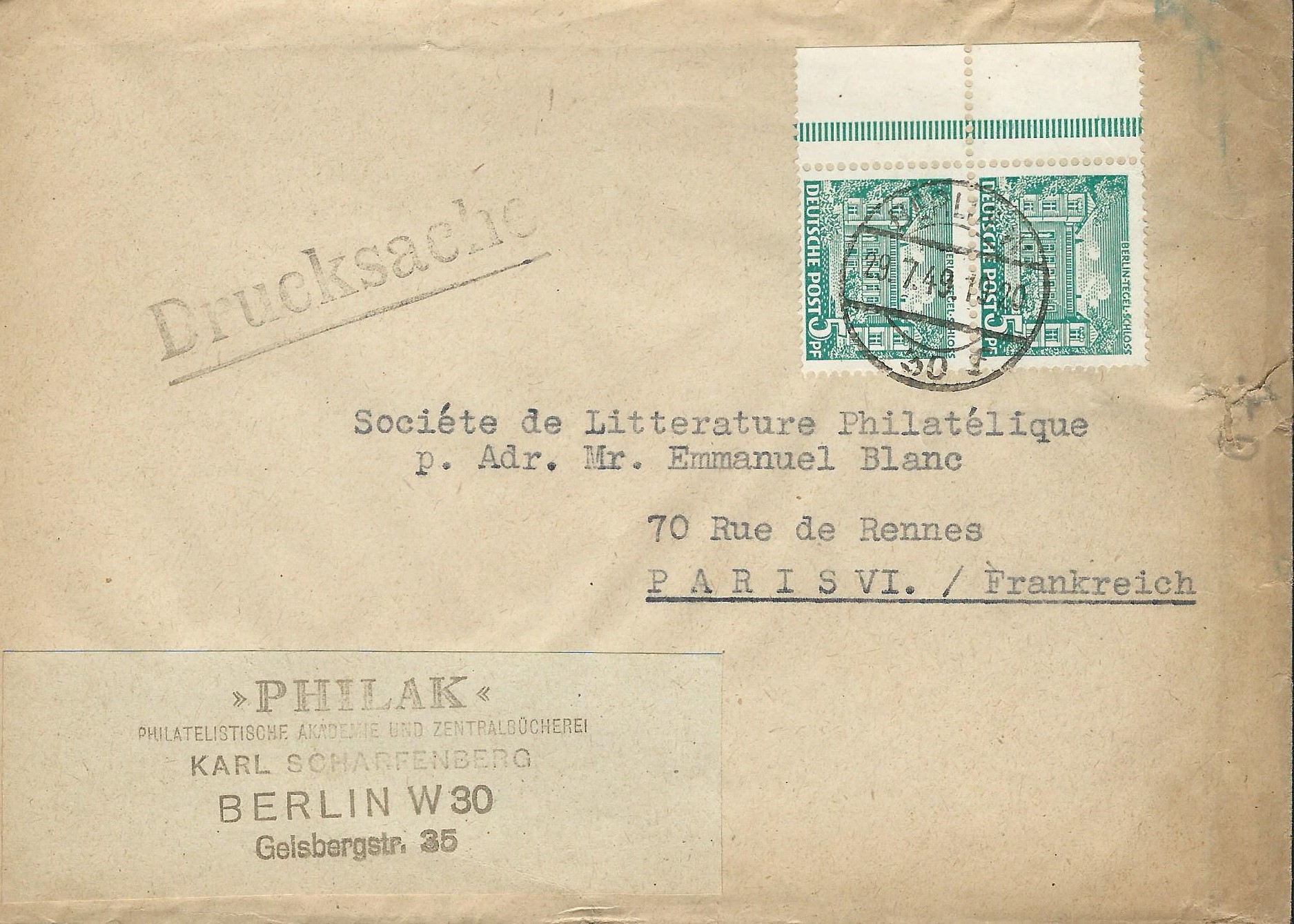hier kann ich ein senkrechtes Paar vom Unterrand auf Beleg zeigen. Gestempelt wurde der Brief, der als Drucksache nach Paris geschickt wurde, am 29.7.49 in Berlin W 30. Der geneigte Leser wird jetzt fragen: Unterrand???Ja, Unterrand! Die Auflösung gibt es 3 Beiträge weiter.