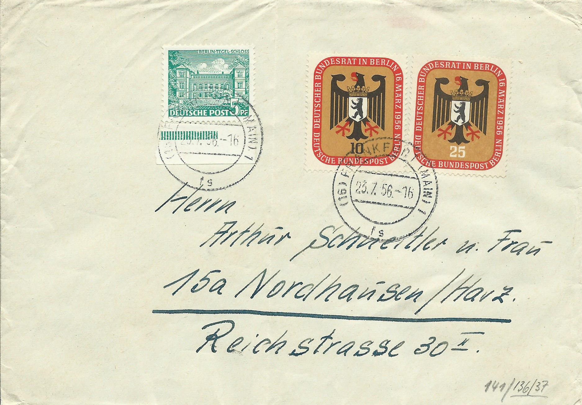 Um die Verwirrung aus dem ersten heutigen Beitrag weiter zu führen, jetzt ein Stück vom rechten Seitenrand nebst Beifrankatur zweier Sondermarken. Auch das mit dem Seitenrand ist kein Schreibfehler! Gestempelt wurde der Beleg am 23.7.56 in Frankfurt am Main.