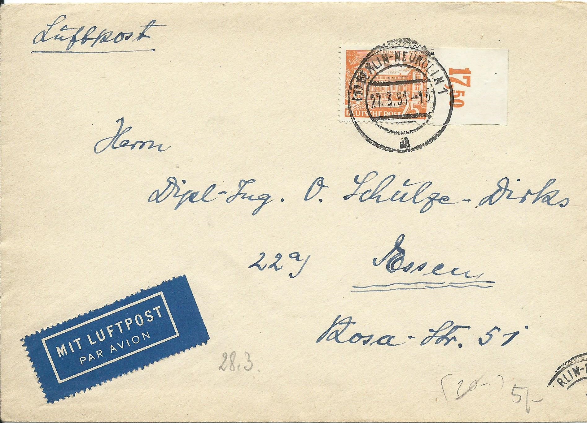 Brief bis 20g mit Luftpost von Berlin nach St.Gall in der Schweiz. Das Porto betrug für einen Auslandsbrief bis 20g 30Pf und der Luftpostzuschlag für 20g 25Pf, macht zusammen 55Pf. Zur Frankatur wurden benutzt: eine Marke zu 5Pf (MiNr 44) und zwei Marken zu 25Pf (MiNr 50).