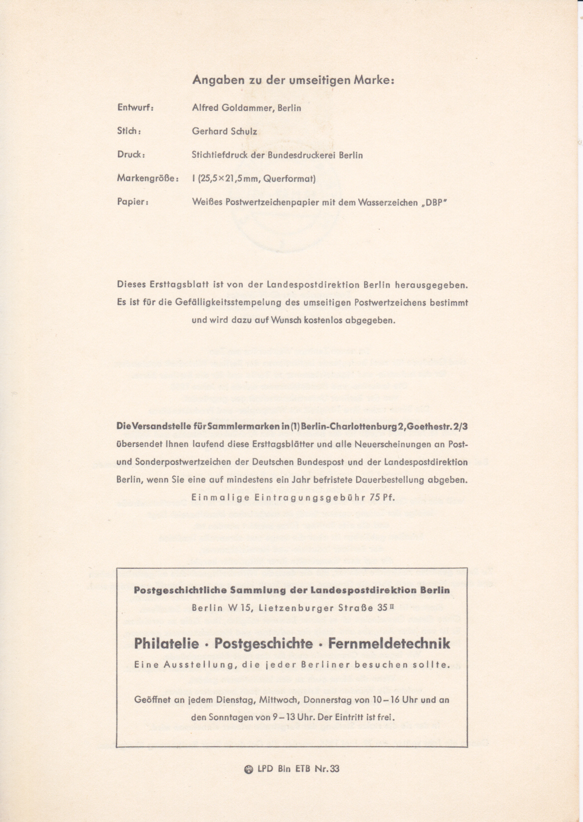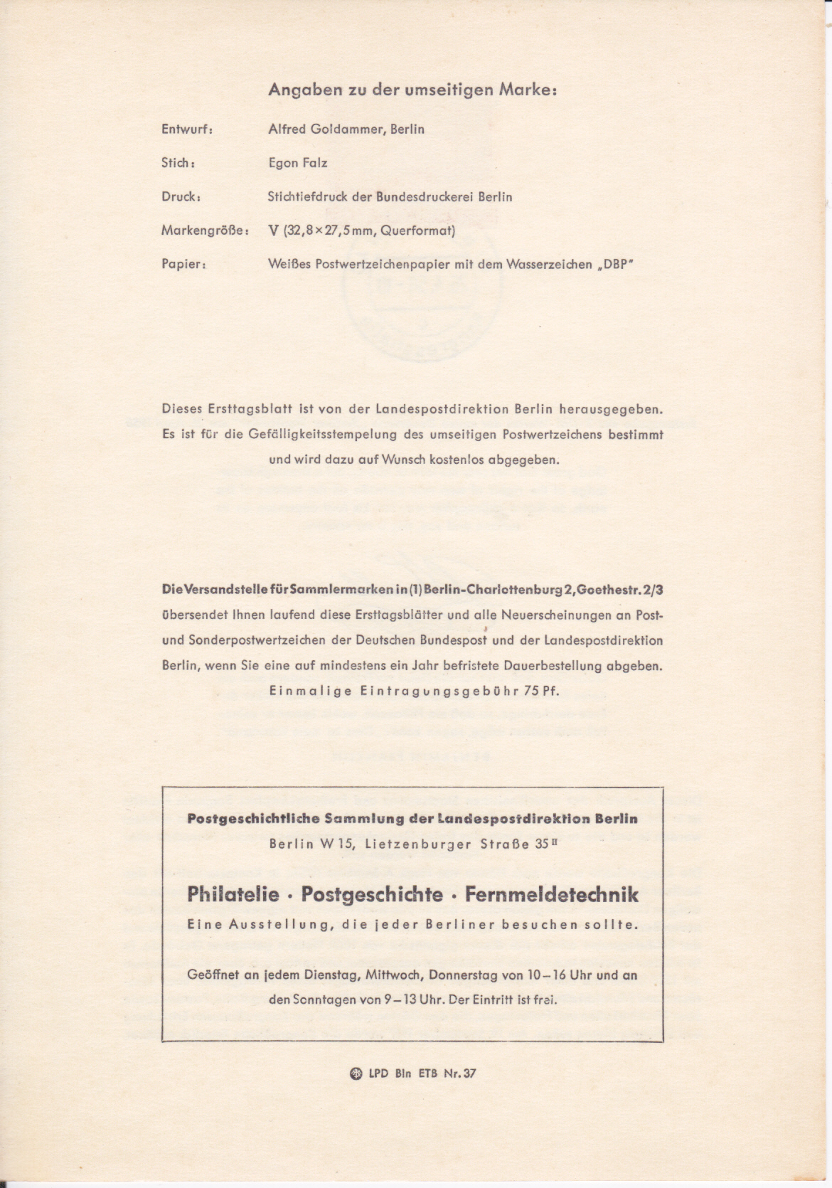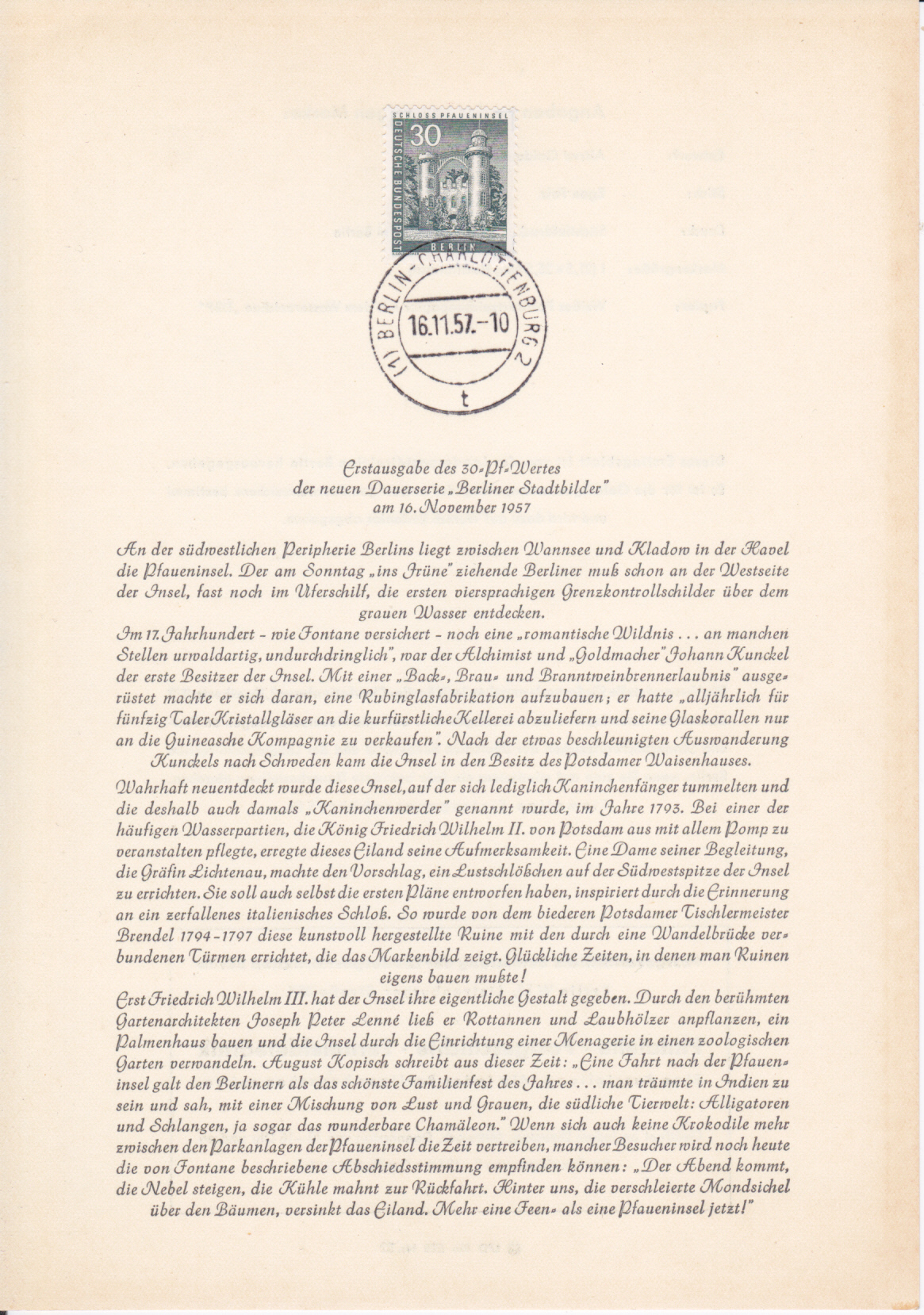 Nachdem Ende 1955 die Herausgabe von "Offiziellen FDCs" in Berlin eingestellt worden war, erschienen ab 1956 Ersttagsblätter mit aufgeklebten gestempelten Marken und Erläuterungen zur Marke. Diese Werden auch im Michel-Katalog aufgeführt.