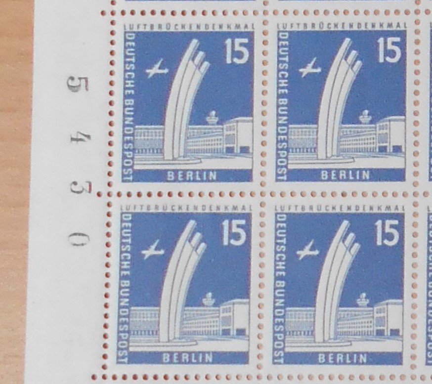 von der Marke zu 1 Pf y habe ich hier noch einen 4-er-Block vom linken Seitenrand mit Bogenzählnummer auf einer Stempelvorlagekarte. Gestempelt wurde mit einem Sonderstempel Berlin am 24.3.63.