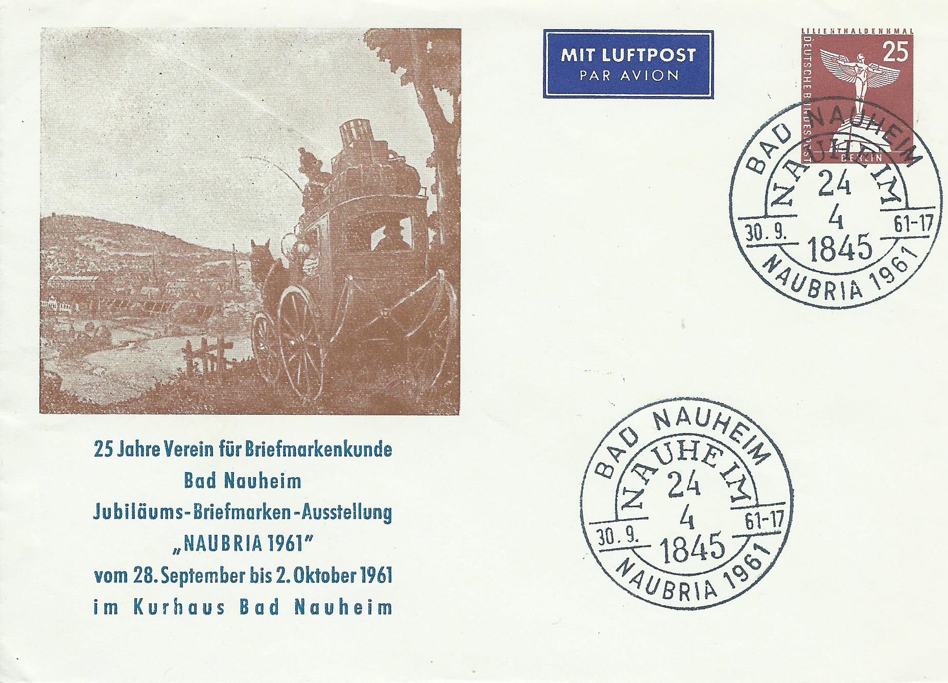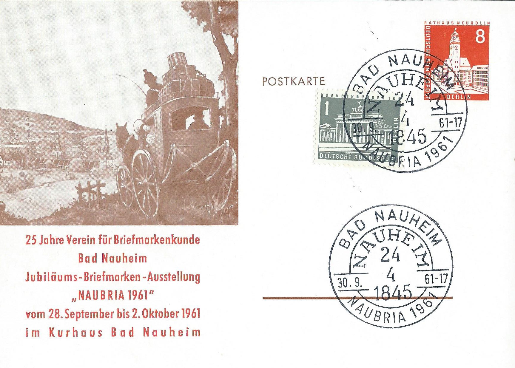 Zum einen ist es der Wertstempel zu 8 Pf orange als Postkarte, hier mit Zusatzfrankatur einer Marke zu 1 Pf Brandenburger Tor. Die Postkarte wurde als Stempelvorlage genutzt für einen Sonderstempel von Bad Nauheim vom 30.9.61 zu ihrer Vereinsausstellung Naubria.
