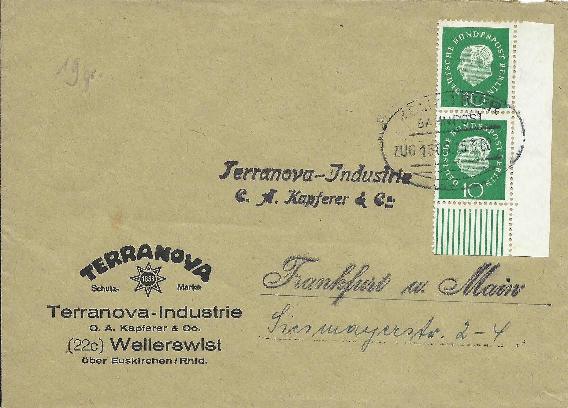 Den Anfang macht ein Beleg mit einem senkrechten Paar der 10 Pf-Marke aus der rechten unteren Bogenecke. Der Brief wurde gestempelt mit einem Bahnpoststempel der Verbindung Köln-Trier am 15.3.60.