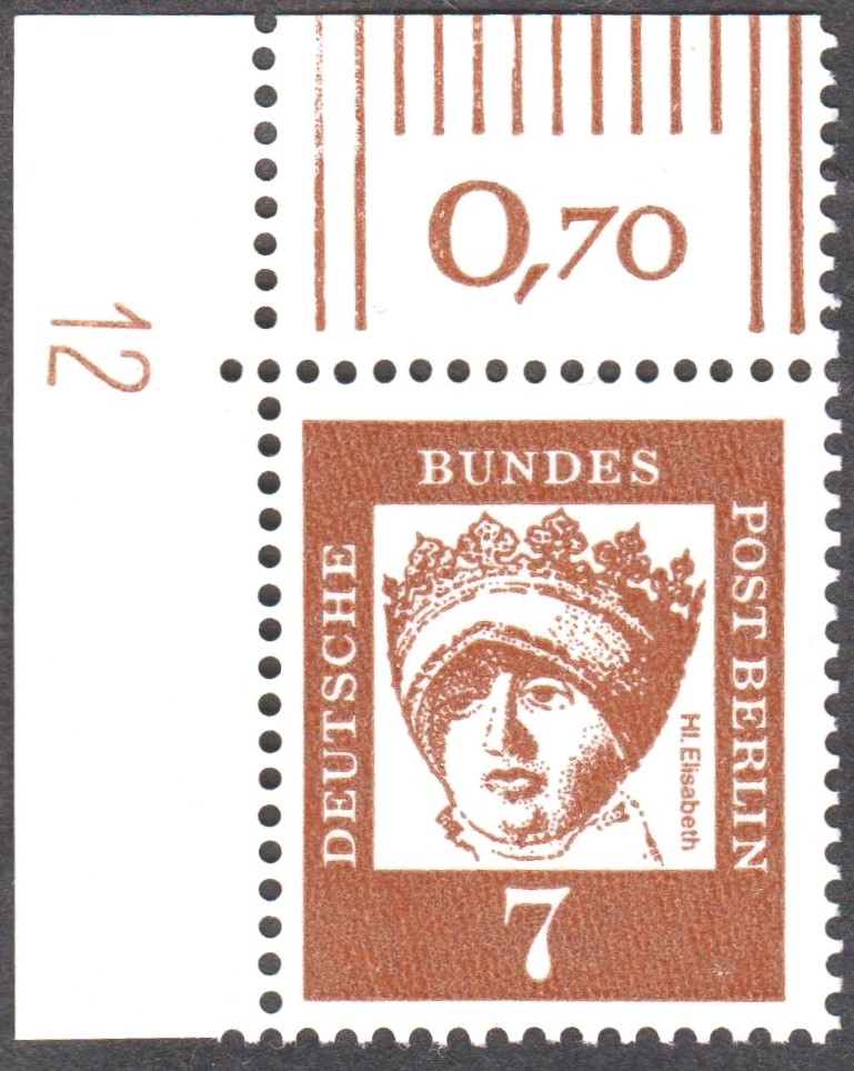 Dauerserie Bedeutende Deutsche, Ausgabe Berlin, Bogenecke oben links (= Bogenfeld 1) der Wertstufe 7 Pf mit Druckerzeichen "12", Berlin MiNr. 200 DZ 12: