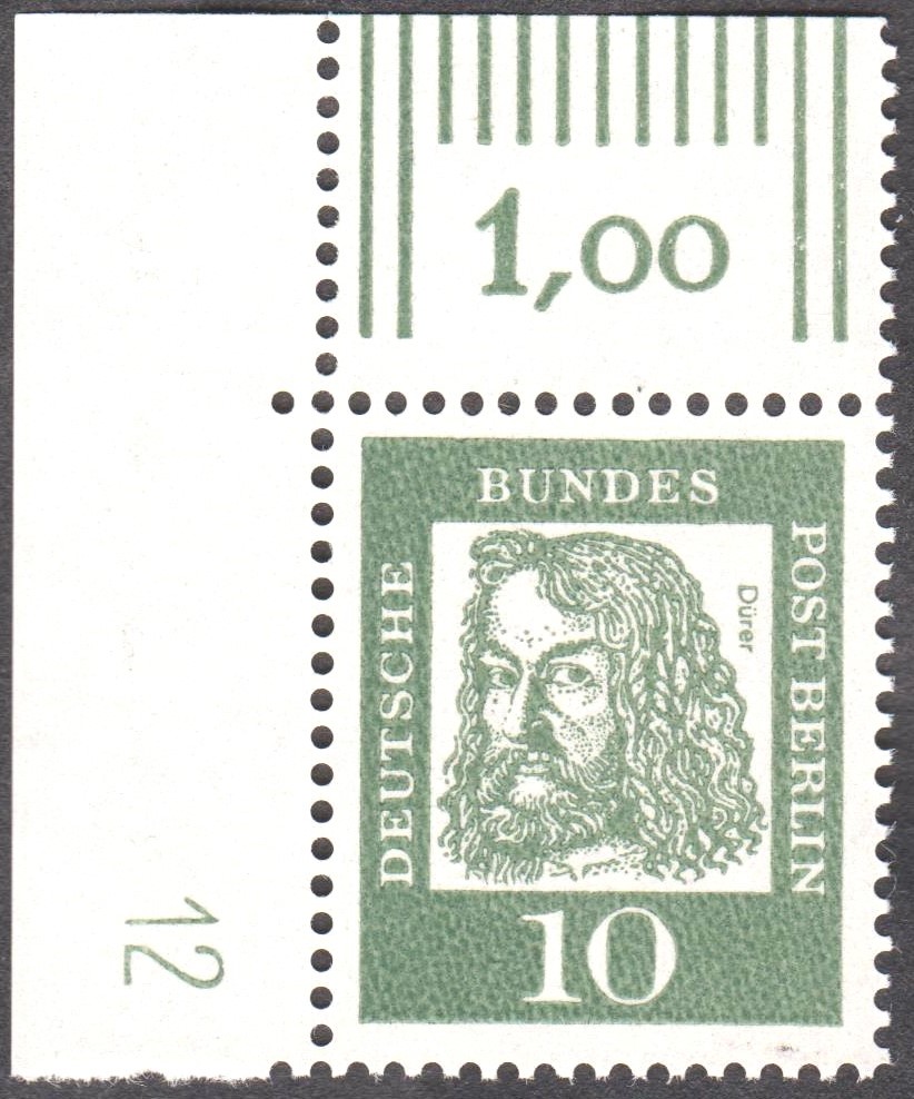 Dauerserie Bedeutende Deutsche, Ausgabe Berlin, Bogenecke oben links (= Bogenfeld 1) der Wertstufe 10 Pf mit Druckerzeichen "12", Berlin MiNr. 202 DZ 12: