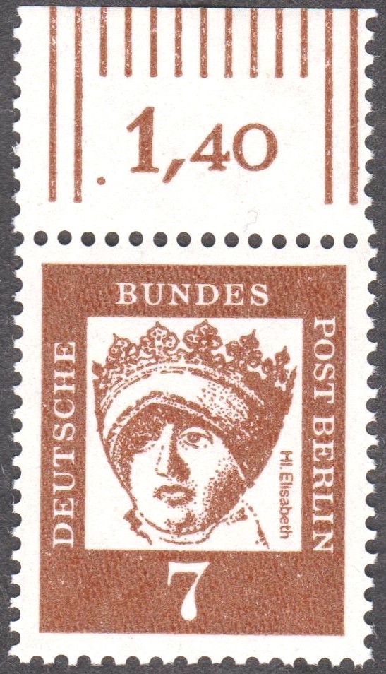 Oberrandstück der Wertstufe 7 Pf mit Reihenwertzahl "1,40" (= Bogenfeld 2) mit einem Punkt in Markenfarbe im Oberrand vor der Reihenwertzahl: