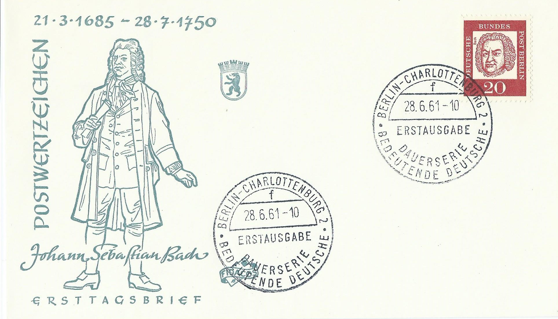 Und einmal der Wert zu 20 Pf auf einem Ersttagsbrief. Gestempelt wurde mit dem Ersttagssonderstempel Berlin-Charlottenburg am 28.6.61: