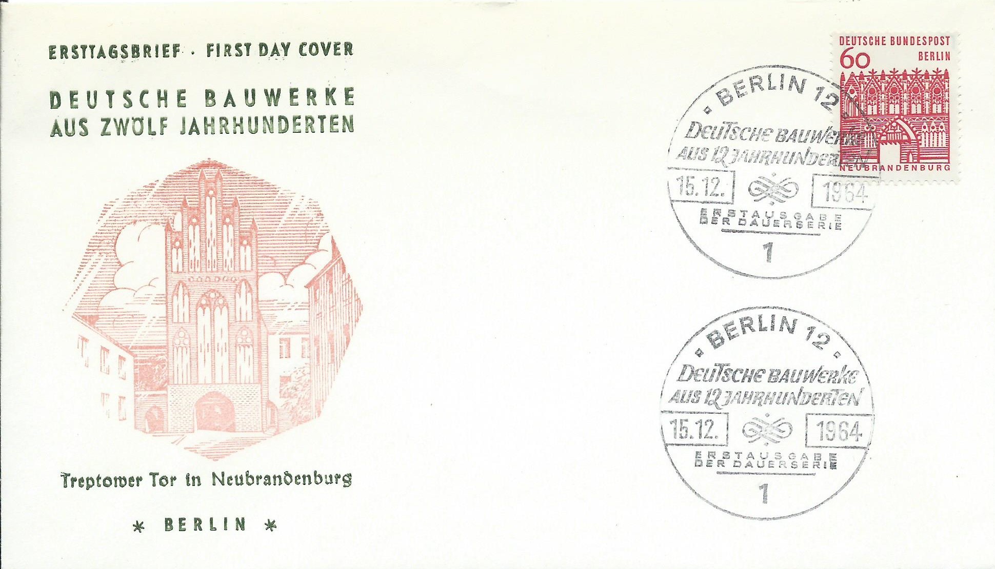 Dann folgt der Wert zu 15 Pf, auch er klebt 2 Mal auf einem gelaufenen Brief mit Ersttagsonderstempel Berlin vom 12.3.65. Dieser Brief ist allerdings nicht portorichtig, das Porto für einen Standart-Brief betrug nur 20 Pf.