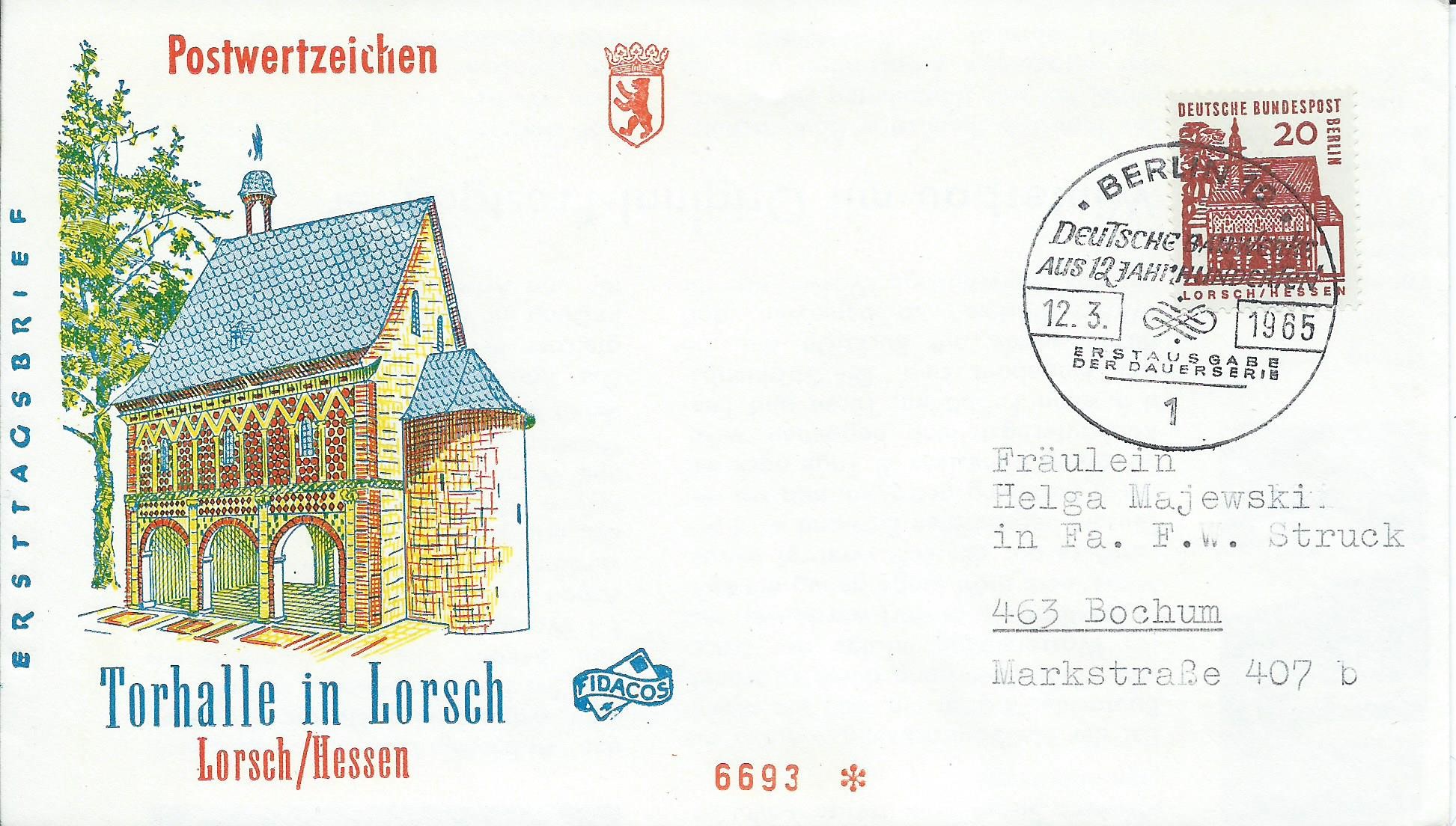 Der Wert zu 10 Pf klebt 2 Mal auf einem gelaufenen Brief mit Ersttagsonderstempel Berlin vom 12.3.65. Zu der Zeit betrug das Porto für einen Fernbrief 20 Pf, er ist somit portorichtig.