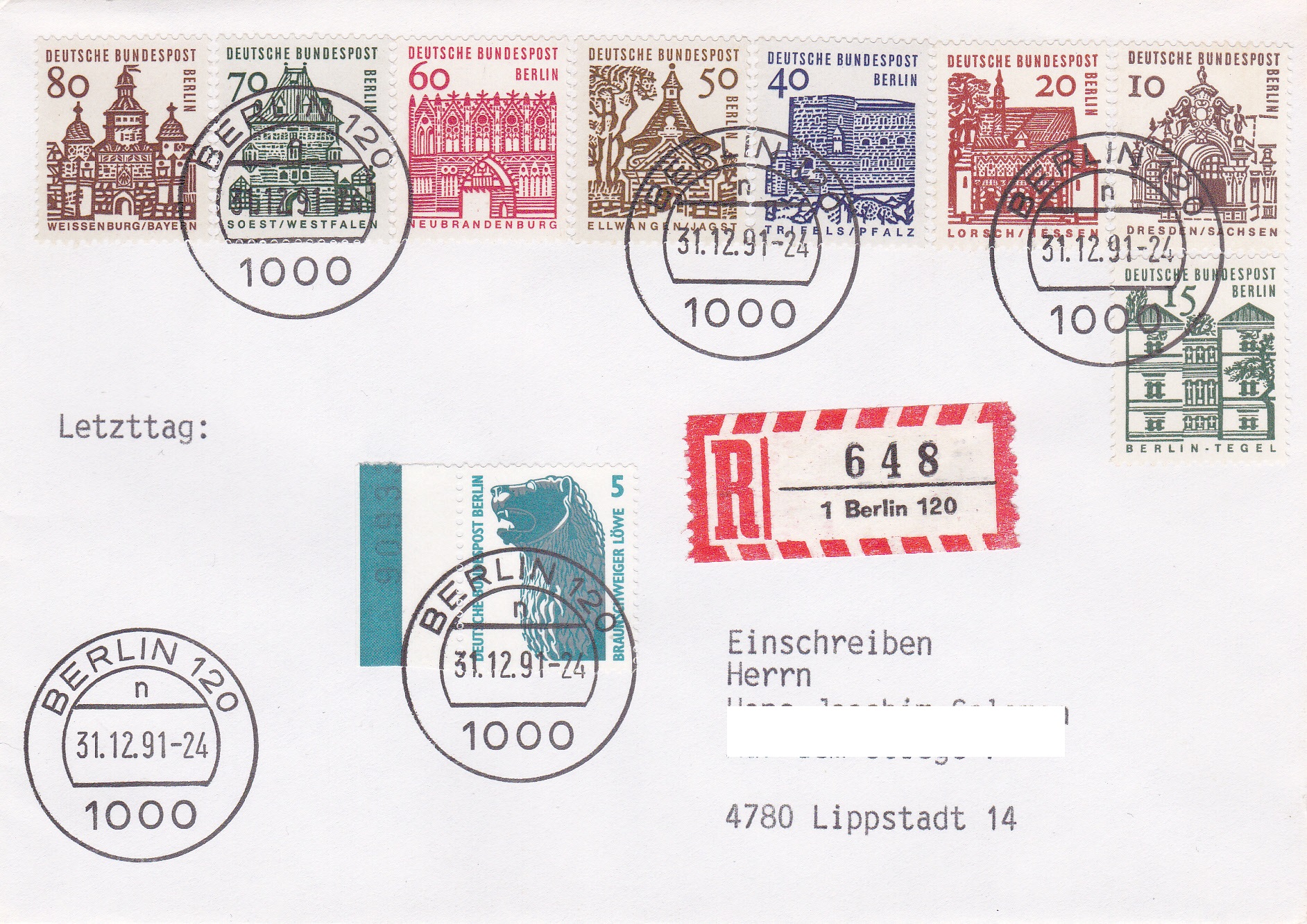 Auf diesem Brief wurde die komplette Serie "Deutsche Bauwerke aus zwölf Jahrhunderten (I)", also die im kleinen Format, verklebt. Da diese Frankatur noch nicht ausreichend war, ist zur Ergänzung noch ein Marke zu 5Pf der Serie "Sehenswürdigkeiten" vom linken Bogenrand verwendet worden, um das notwendige Porto zu erreichen. (Brief bis 20 g 100Pf, Zusatzleistung Einschreiben 250Pf). Der Brief hat einen Stempel aus Berlin 12 vom 31.12.1991 - 24 Uhr.