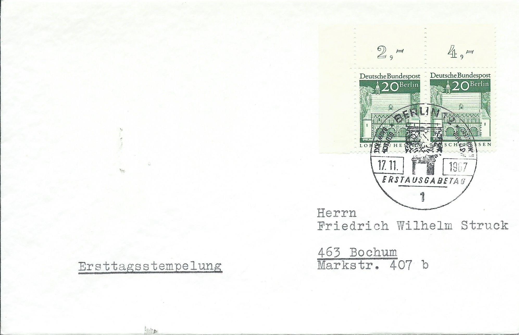 Hier ein waagerechtes Paar der Wertstufe 20 Pf aus der linken oberen Bogenecke mit passendem Ersttagsonderstempel von Berlin vom17.11.67. Zu der Zeit kostete ein Brief im Fernverkehr 30 Pf, somit sind hier auch wieder 10 Pf zu viel.