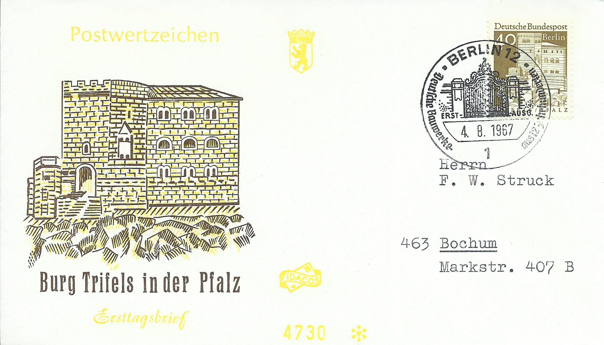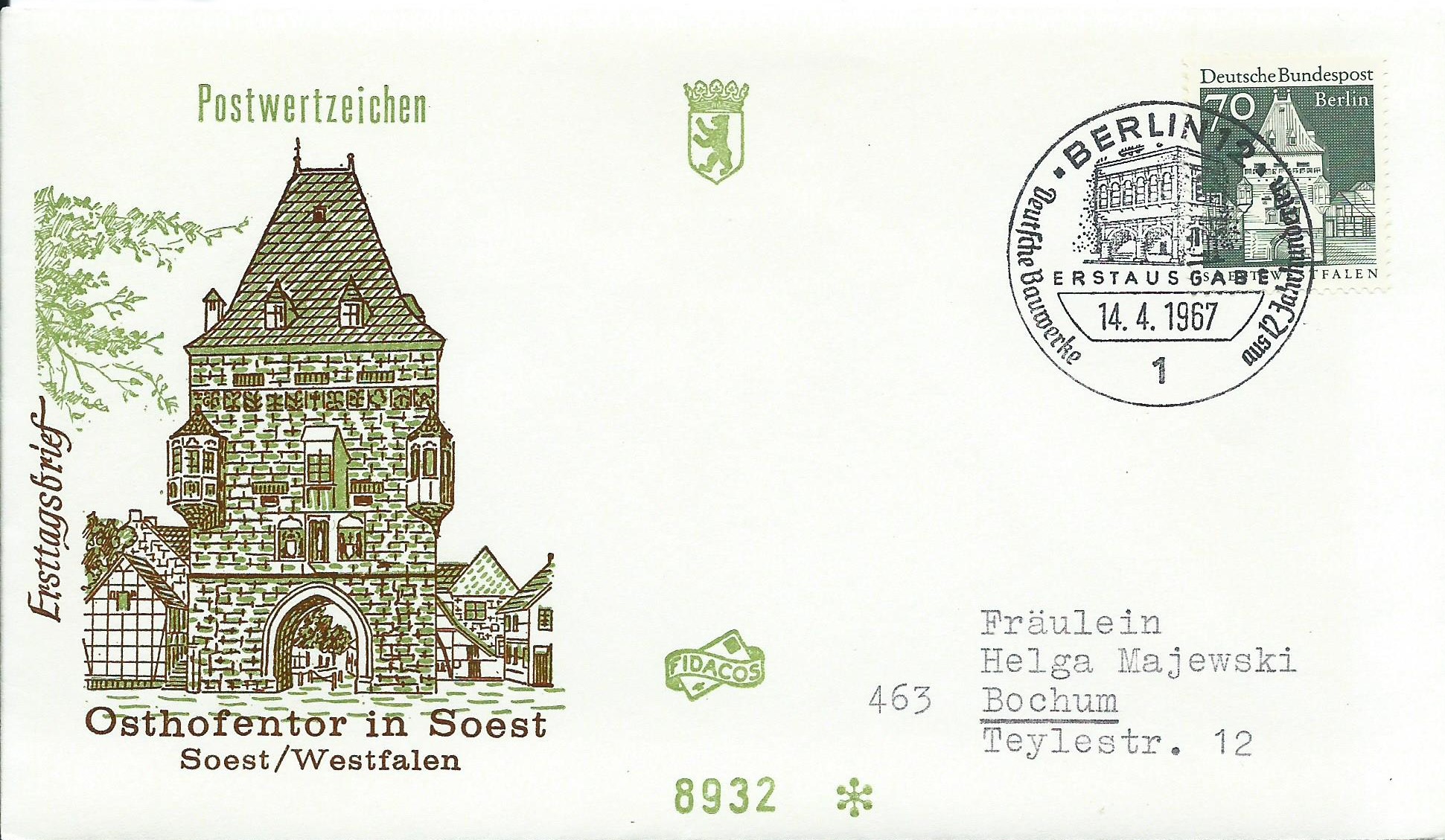 70 Pf wäre eigentlich die Portostufe für Briefe über 100 bis 250 Gramm, das würde man aber in solch einen kleinen Umschlag niemals hinein bekommen. Aber der Beleg ist wenigstens gelaufen. Gestempelt wurde mit dem Ersttagsonderstempel Berlin vom 14.4.67.