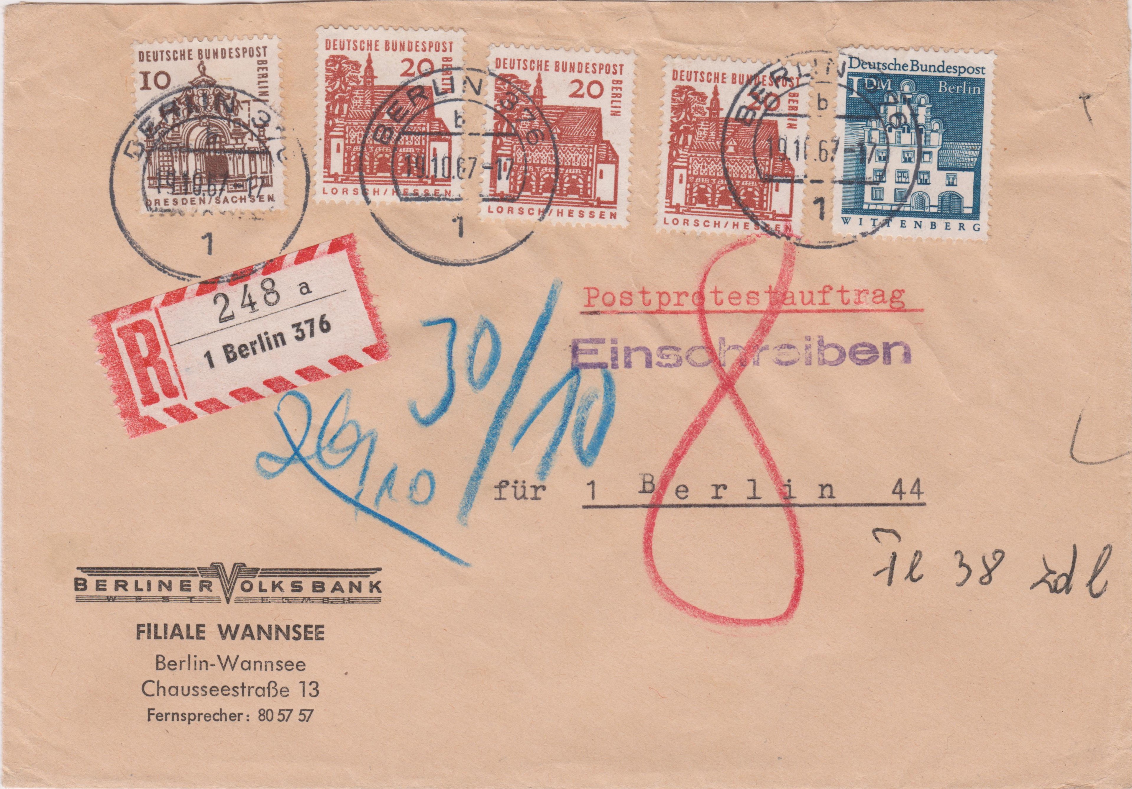 Mischfrankatur der Berliner Dauerserien Deutsche Bauwerke aus zwölf Jahrhunderten I und II zur Abdeckung der Portostufe 170 Pf am 19.10.1967 für einen Postprotestauftrag, gelaufen im Ortsverkehr von Berlin 376 nach Berlin 44: