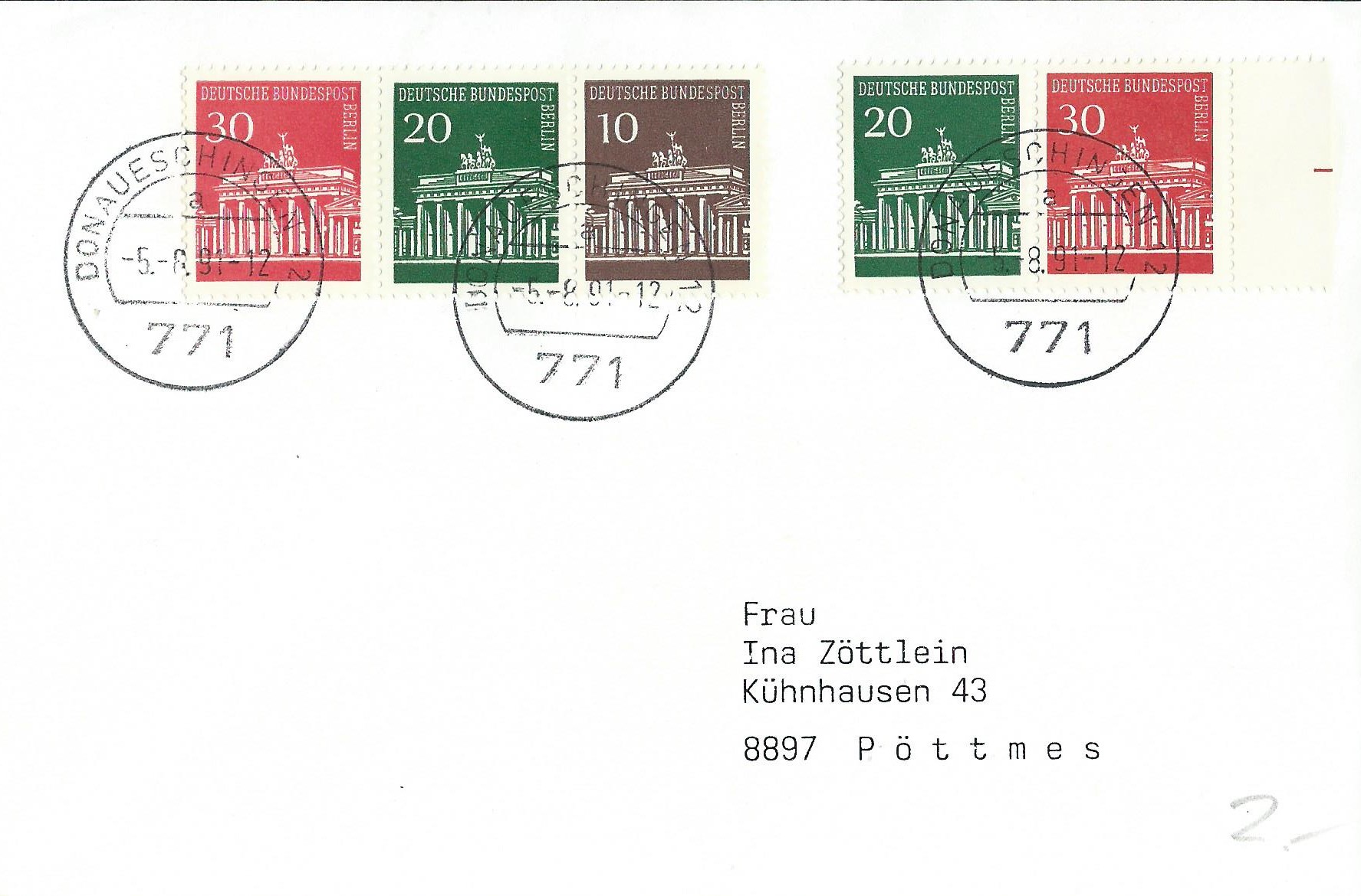 auf diesem Beleg sind 2 Zusammendrucke aus dem Heftchenbogen Brandenburger Tor verklebt worden. Einmal der Zusammendruck W 43 (30/20/10) und einmal W 45 (20/30). Gestempelt wurde er in Donaueschingen am 5.8.91 und ist mit 110 Pf auch portorichtig frankiert. Beim W 45 ist rechts noch der Seitenrand vorhanden, der macht die Sache richtig interessant! Dort ist noch ein kleiner roter Strich, der Anlagestrich zu sehen! Den haben wir hier im Thread weiter vorne schon mal beschrieben.