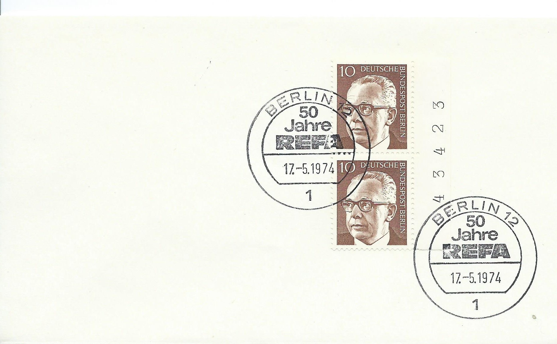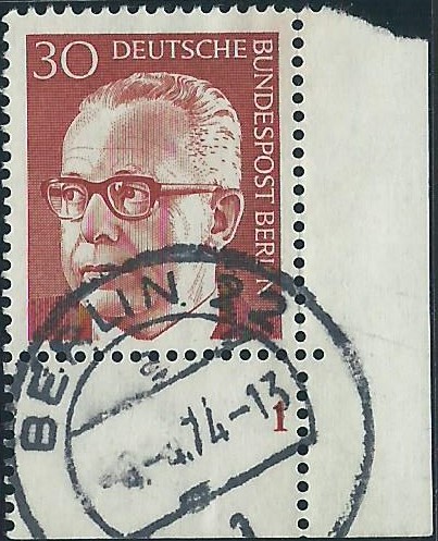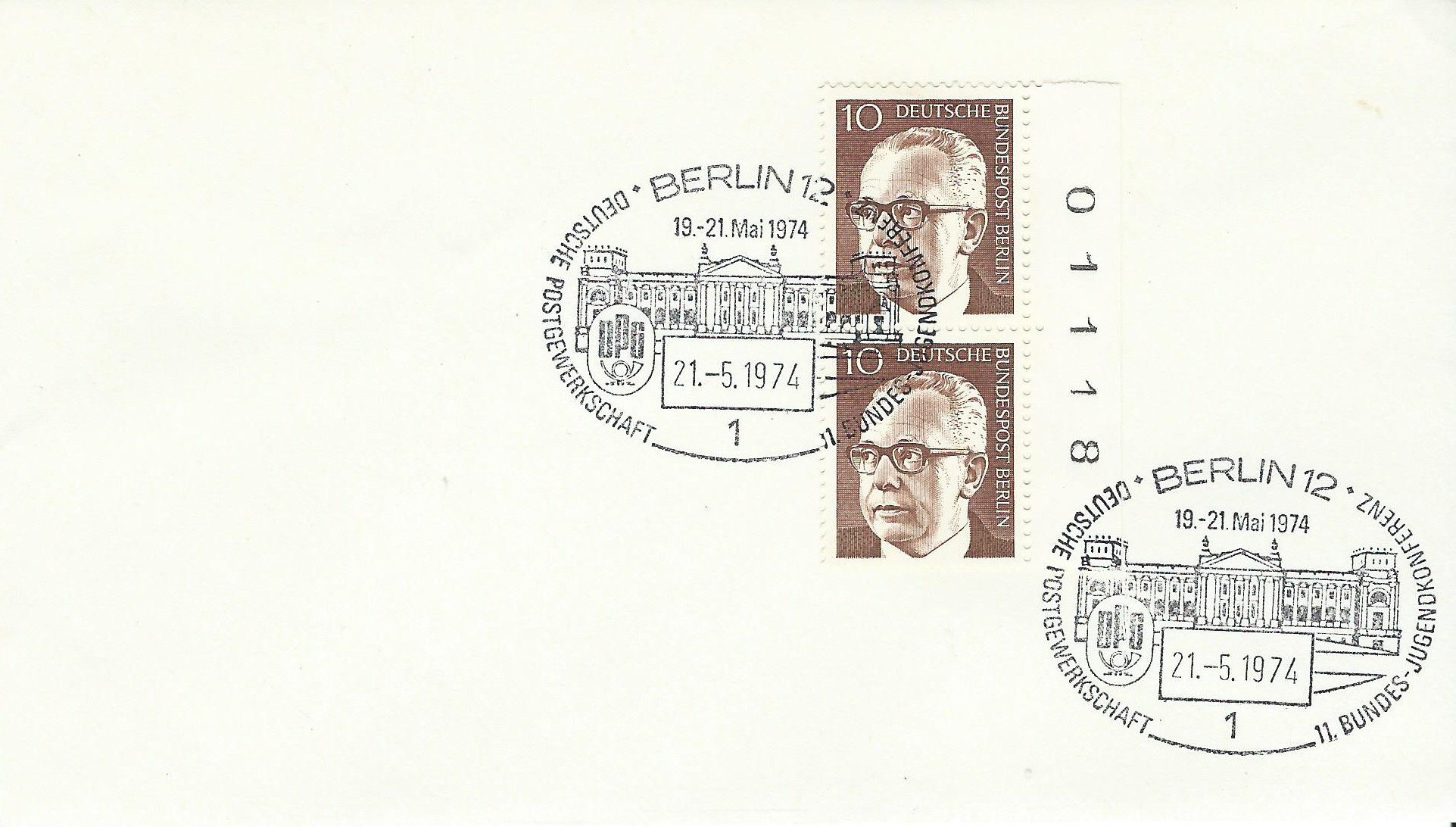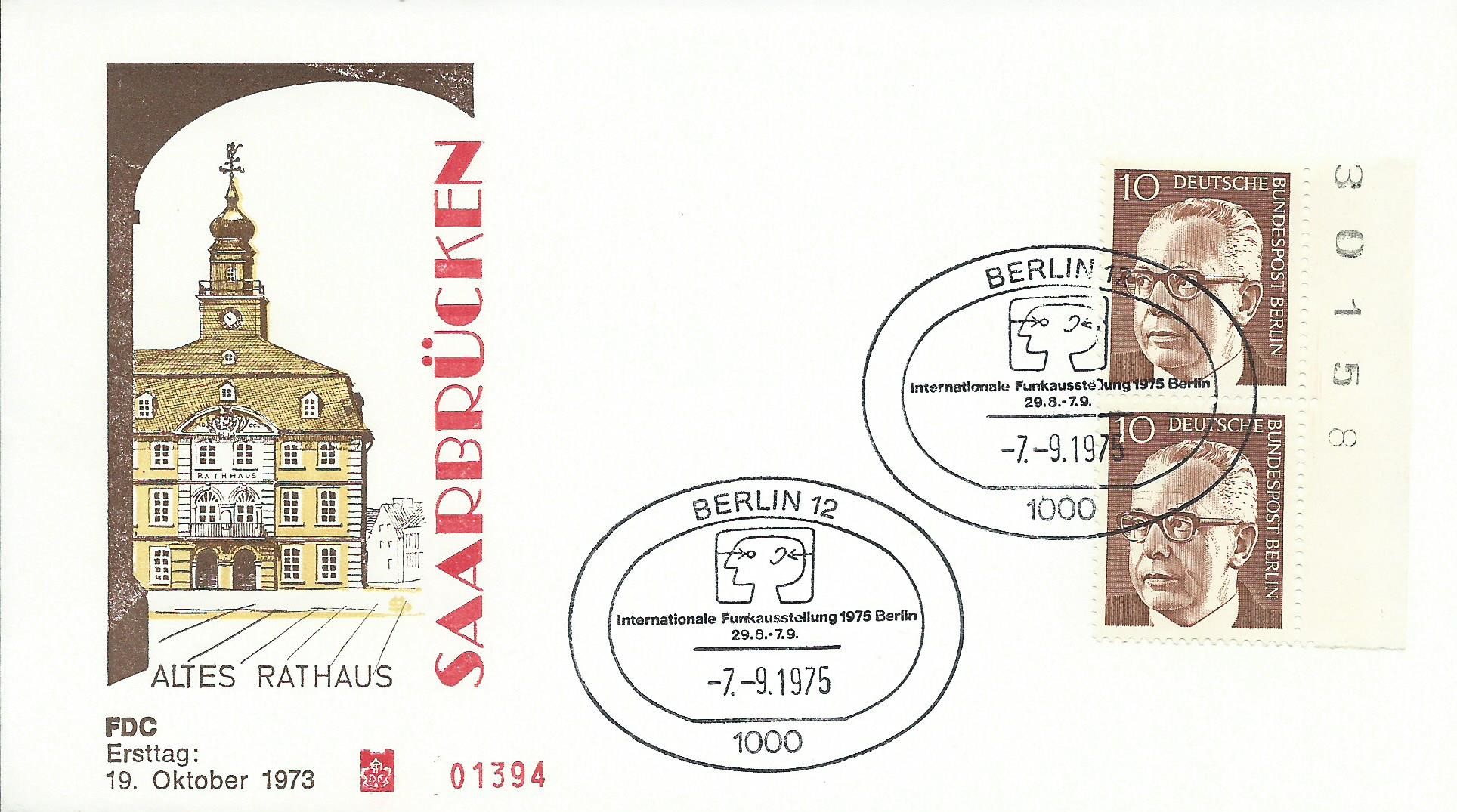 Den Anfang macht der Wert zu 5 Pf, hier als senkrechtes Paar vom rechten Bogenrand. Auf dem Bogenrand ist noch die Bogenzählnummer zu sehen. Gestempelt wurde mit einem Berlin-Sonderstempel vom 21.9.75.