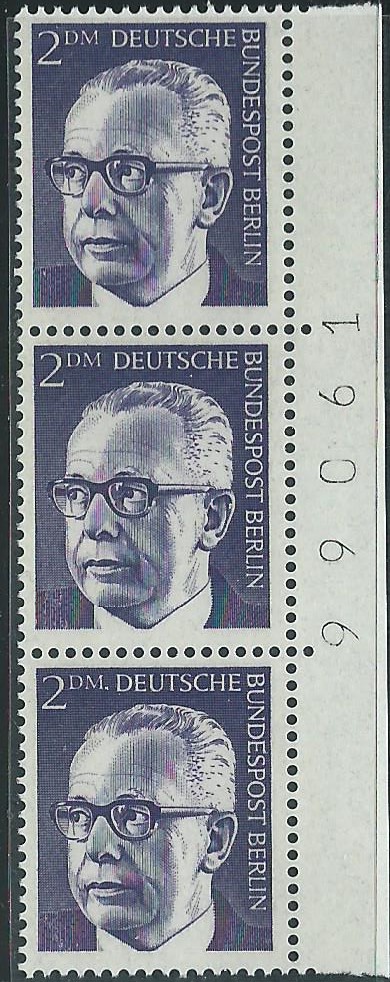 Der Wert zu 2 DM vom rechten Bogenrand als senkrechter 3-er-Streifen mit Bogenzählnummer: