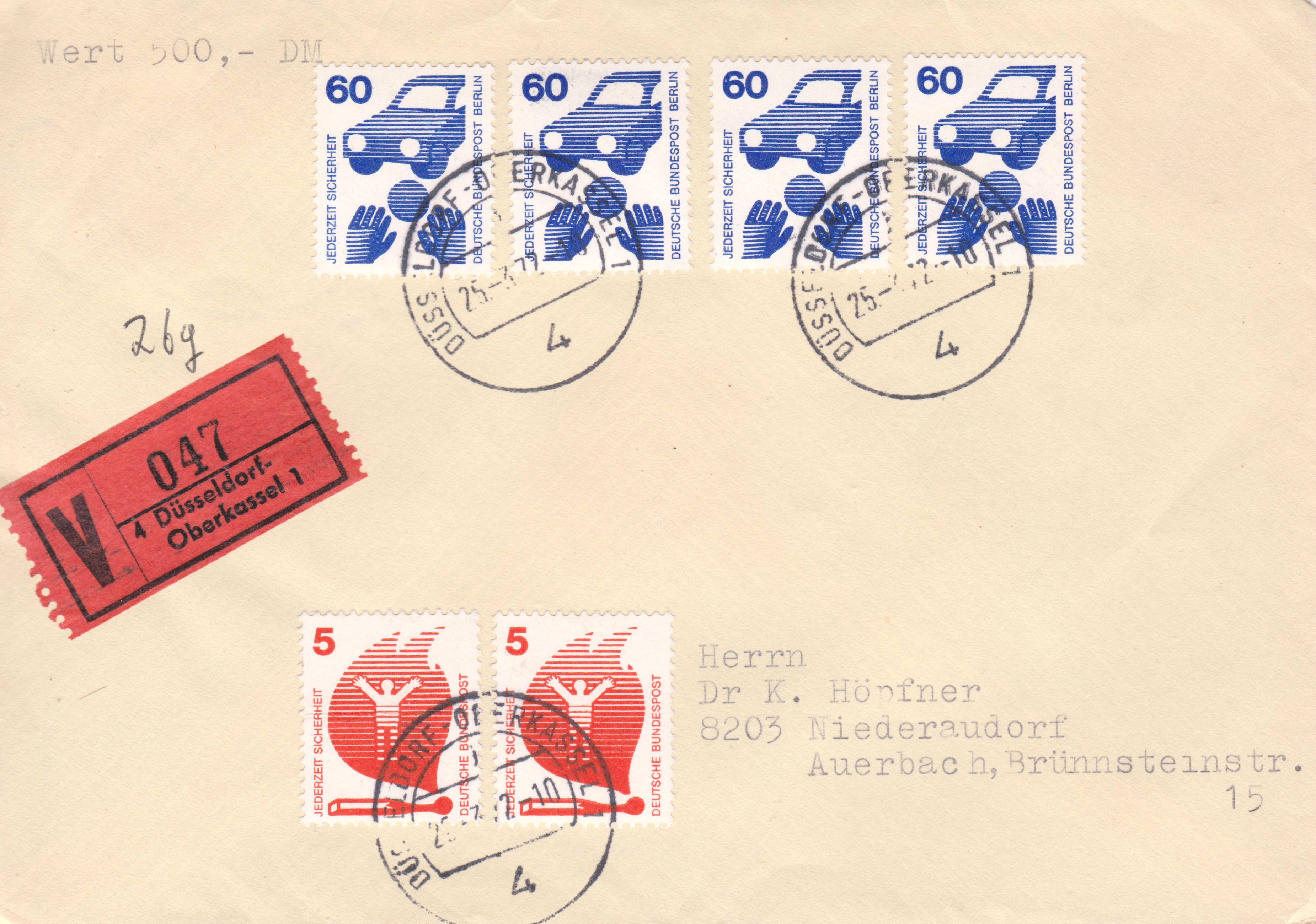 Mischfrankatur von 4 x 60 Pf Dauerserie Unfallverhütung, Ausgabe Berlin, sowie 2 x 5 Pf Dauerserie Unfallverhütung, Ausgabe Bund, auf einem Wertbrief mit einem Gewicht von 26 g, der am 25.03.1972 in Düsseldorf aufgegeben wurde:
