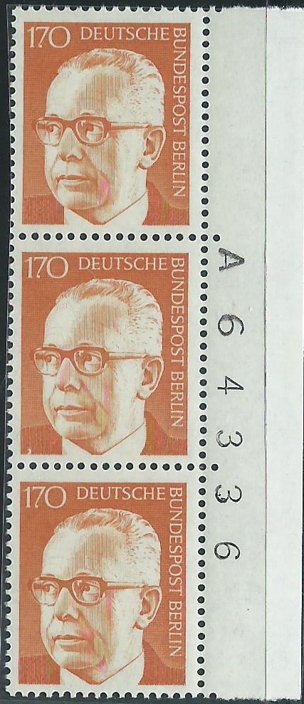 Ein Ersttagsbrief mit dem Wert zu 15 Pf dreimal mit linkem Seitenrand auf einem Luftpostbrief. Gestempelt wurde am 20.6.72 mit dem Ersttagssonderstempel Berlin.