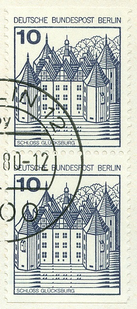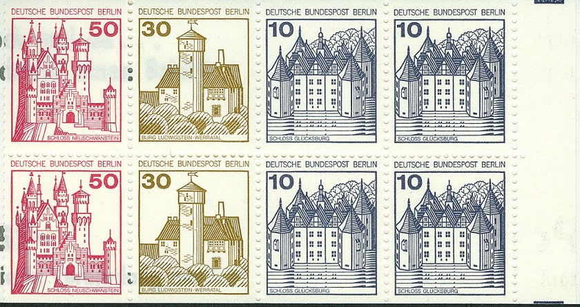 einige Marken der Serie Burgen und Schlösser wurden auch als Markenheftchen aufgelegt. Hier haben wir die Werte zu 10, 30 und 50 Pf, jeweils als Zusammendruck im 8-er-Block. Auffällig sind hier die oben und unten geschnittenen Marken. Oftmals wurden die Markenheftchen, wenn sie denn gestempelt mal zu erhalten sind, von der Versandstelle Berlin 12 abgestempelt. Hier habe ich ein Heftchen 10 mit dem eingeklebten Heftchenblatt 18, welches in Berlin 65 am 6.9.79 abgestempelt wurde. Wenn Euch also komplette Heftchen oder lose Heftchenblätter über den Weg laufen, dann macht Ihr nie etwas falsch, andere Abstempelungen als Berlin 12 im Tausch oder Kauf mit zu nehmen.
