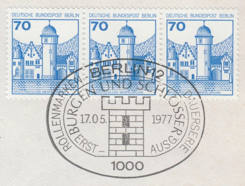 Der 70 Pf Wert der Dauerserie Burgen und Schlösser erschien am 17.05.1977. Hier als Briefstück ein mit ESST entwerteter waagerechter Dreierstreifen aus dem Bogen: