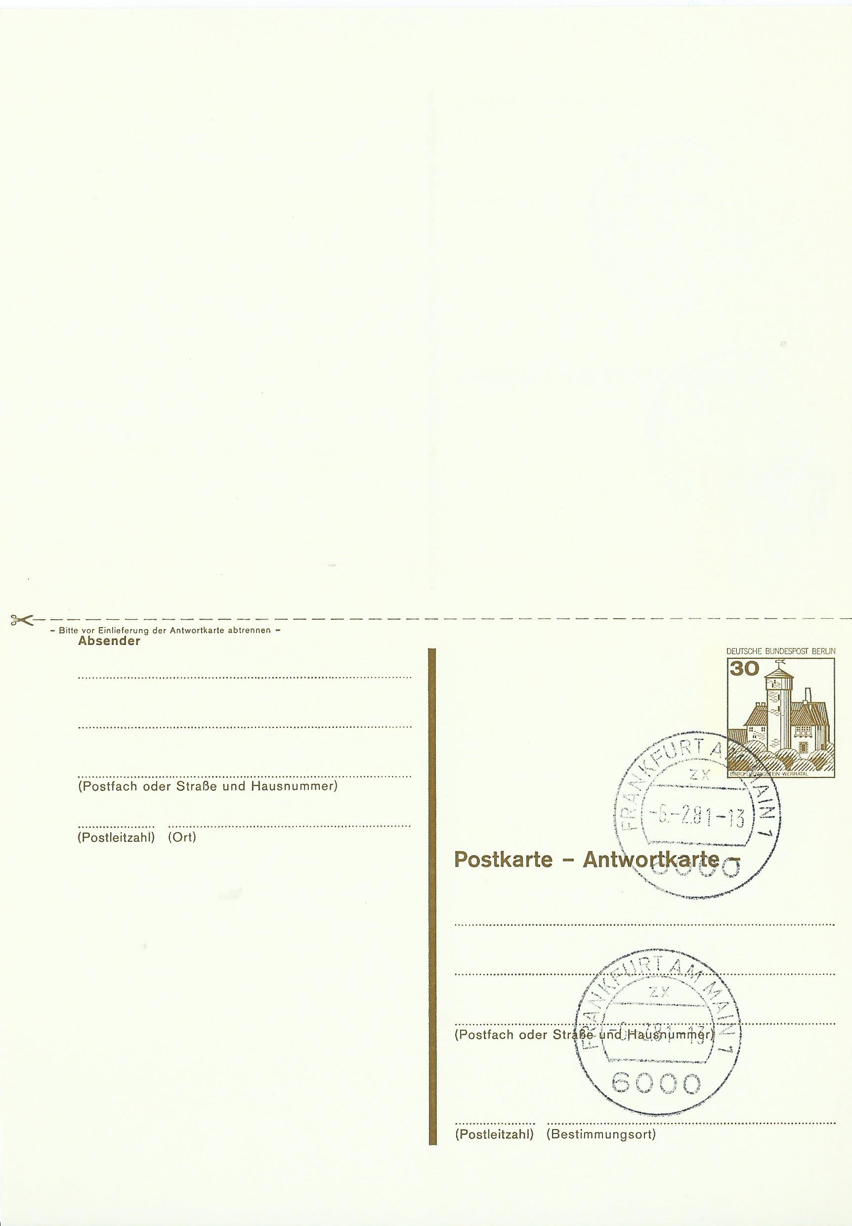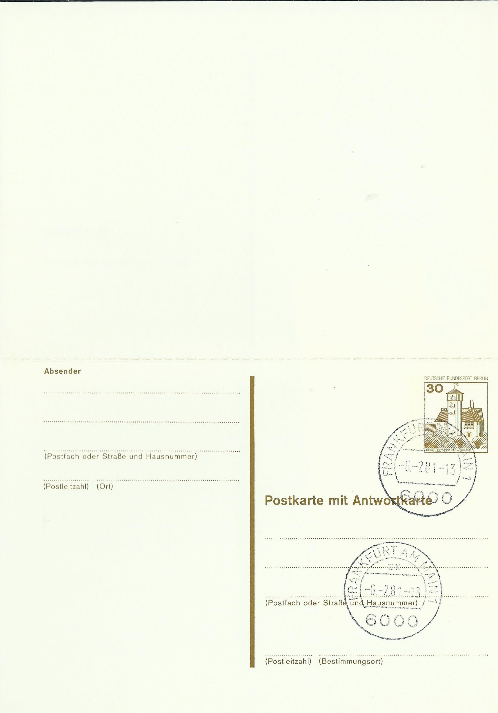 Und eine Postkarte mit Antwortkarte zu 30 Pf (MiNr P 118) mit Stempel Frankfurt am Main vom 6.2.81: