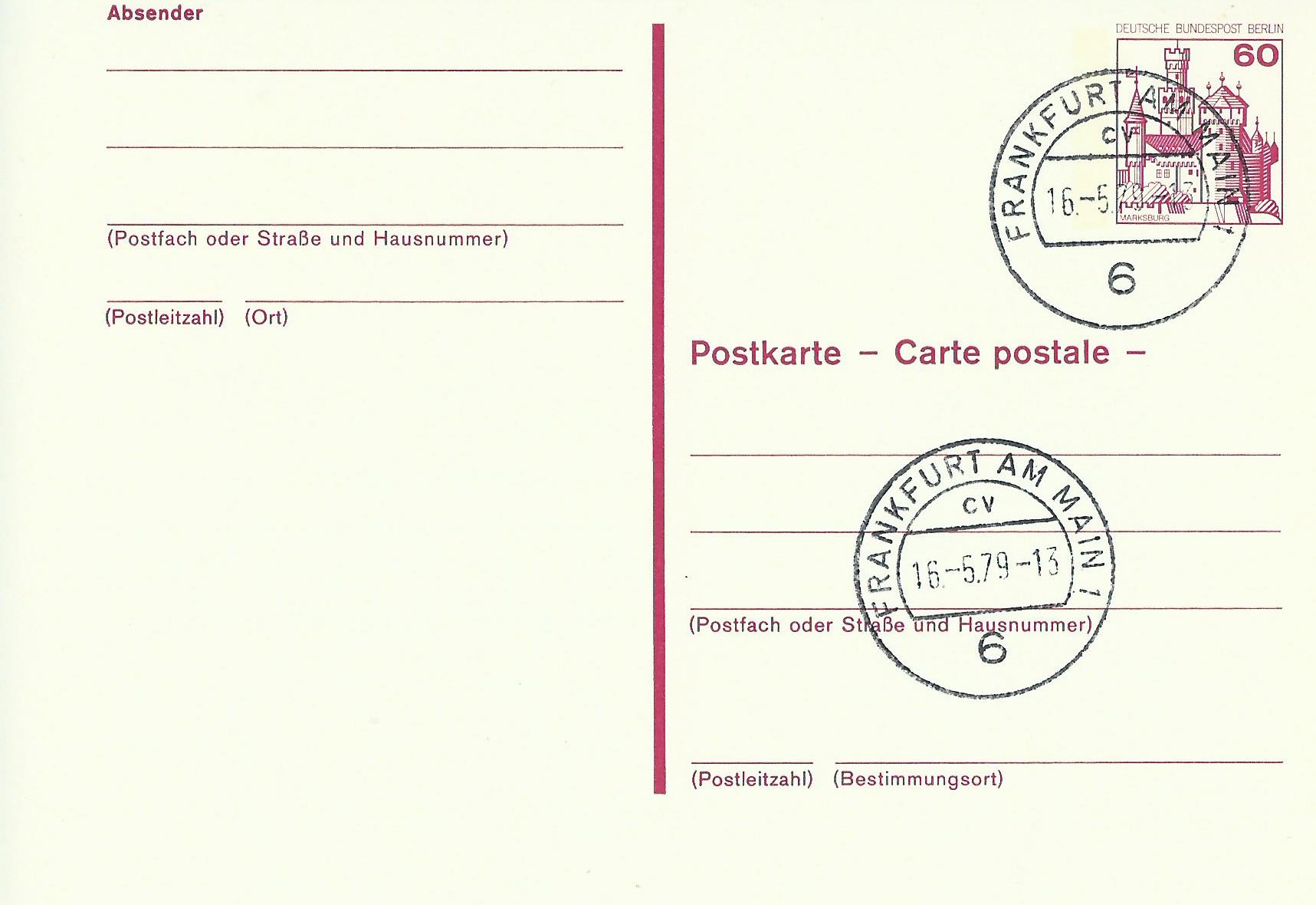 Hier eine Postkarte zu 60 Pf mit farblich abweichendem Wertstempel der Marksburg (MiNr P 110) mit Stempel Frankfurt am Main vom 16.5.79: