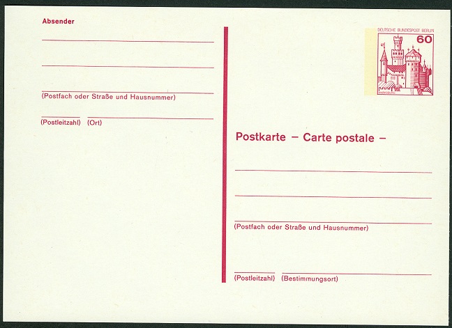 Eine ungebrauchte P 110, mit dem 60 Pfennig - Wertstempel-Motiv "Marksburg". Jedoch in magenta gedruckt.