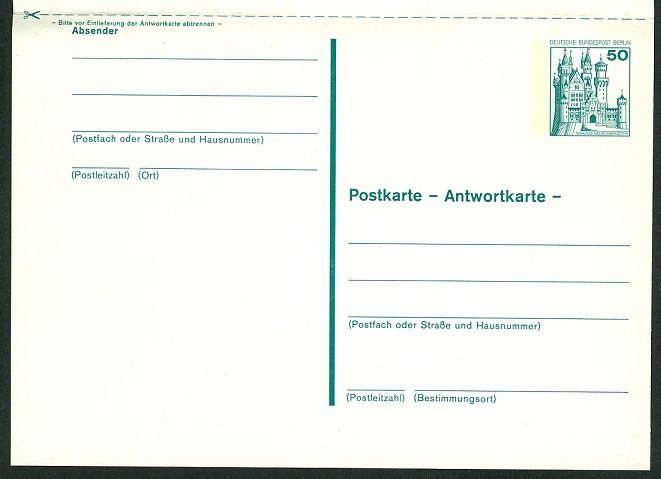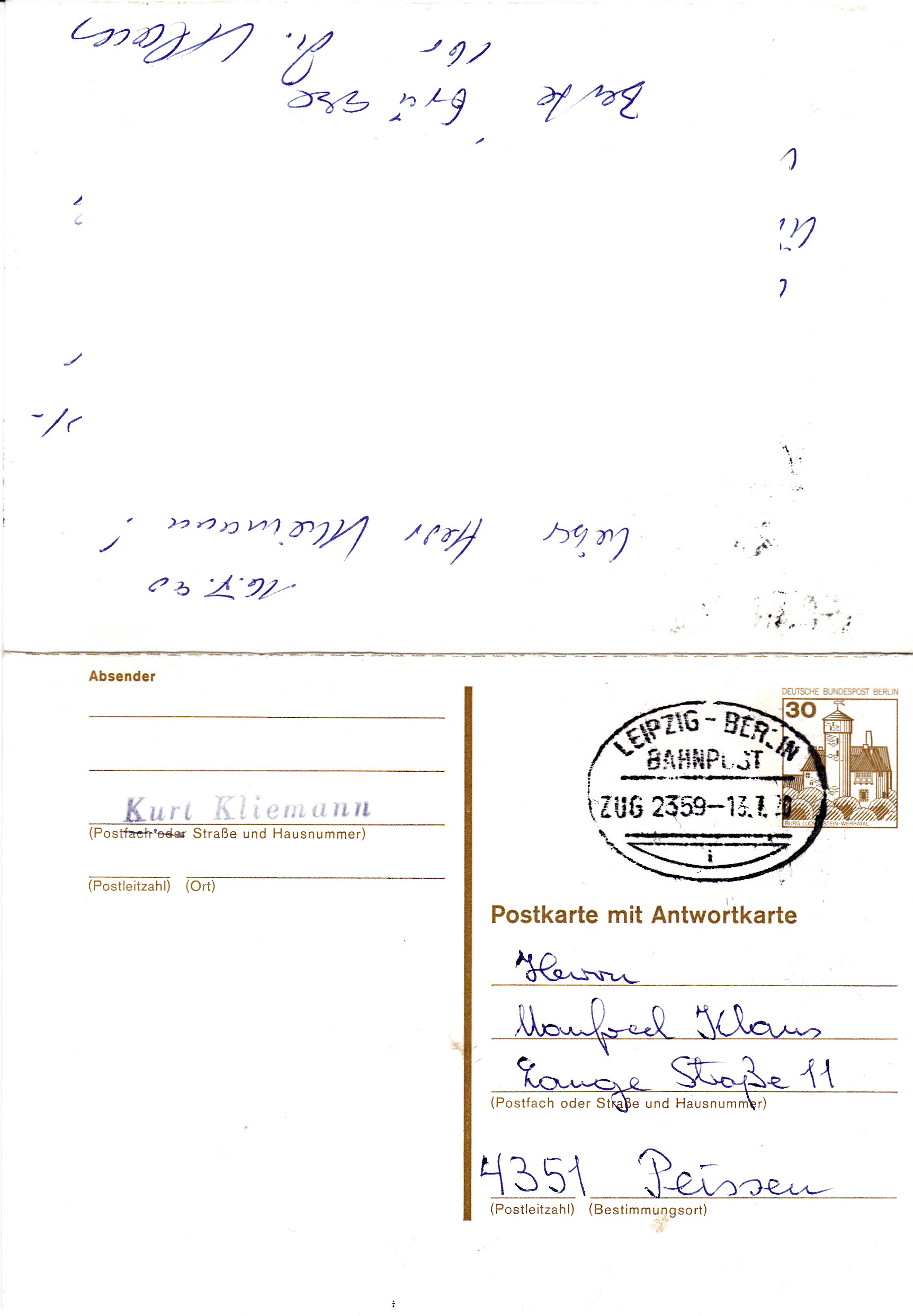 Hier eine im Juli 1990 im VGO zum Sondertarif benutzte Postkarte mit Antwortkarte (MiNr P 110). Die Antwortkarte wurde nicht von der Fragekarte getrennt, sondern zusammenhängend verschickt. Die Fragekarte wurde mit einem Bahnpoststempel Leipzig - Berlin entwertet.