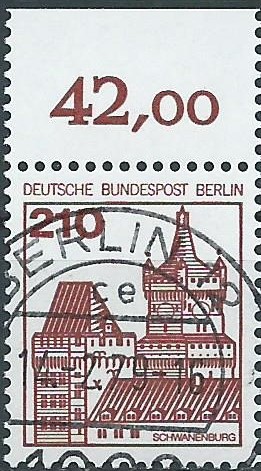 die Marke zu 210 Pf war als Portostufe für Einschreiben gedacht. Als solches wurde sie hier auch genutzt und am 10.7.80 in Bonn auf die Reise geschickt. Es handelt sich hier um ein linkes oberes Eckrandstück, auf dem auch noch links unten im Rand das Plattenzeichen zu erkennen ist.