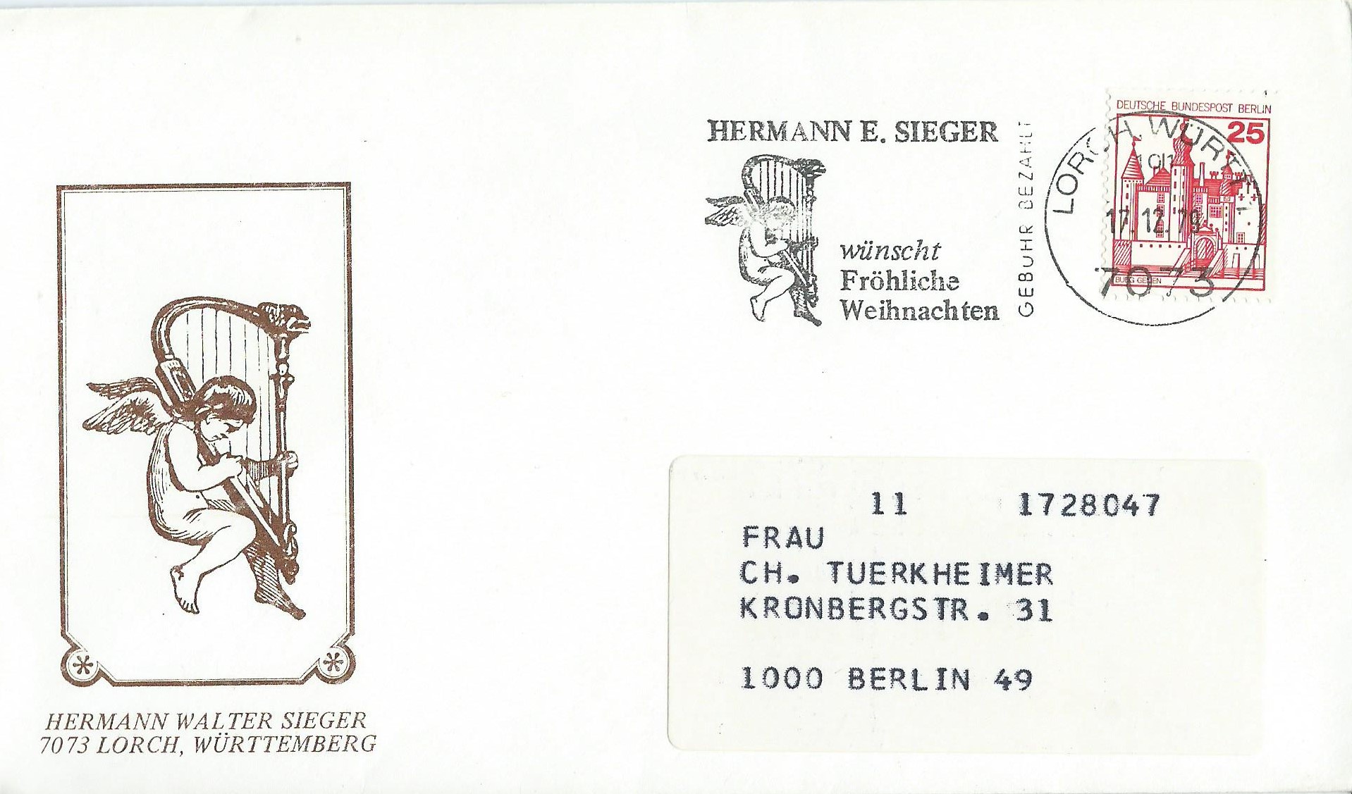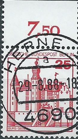 Und noch eine Verwendung aus dem Verkehrsgebiet Ost (ehemalige DDR): Ein waagerechtes Paar aus der rechten oberen Bogenecke mit Tagesstempel Gerstungen vom 30.3.91. Das war ein Samstag und somit die letzte Gelegenheit, das alte „Ost-Porto“ am Schalter gestempelt zu dokumentieren. Ab dem 1.4.91 (zwar ein Montag, aber Ostern!) galt auch in der ehemaligen DDR das Porto der Bundesrepublik, für einen Standartbrief also 1 DM.