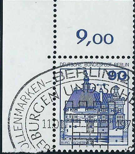 von der Marke zu 90 Pf wird hier ein linkes oberes Eckrandstück gezeigt. Es wurde mit dem Ersttagssonderstempel von Berlin am 11.1.79 gestempelt.
