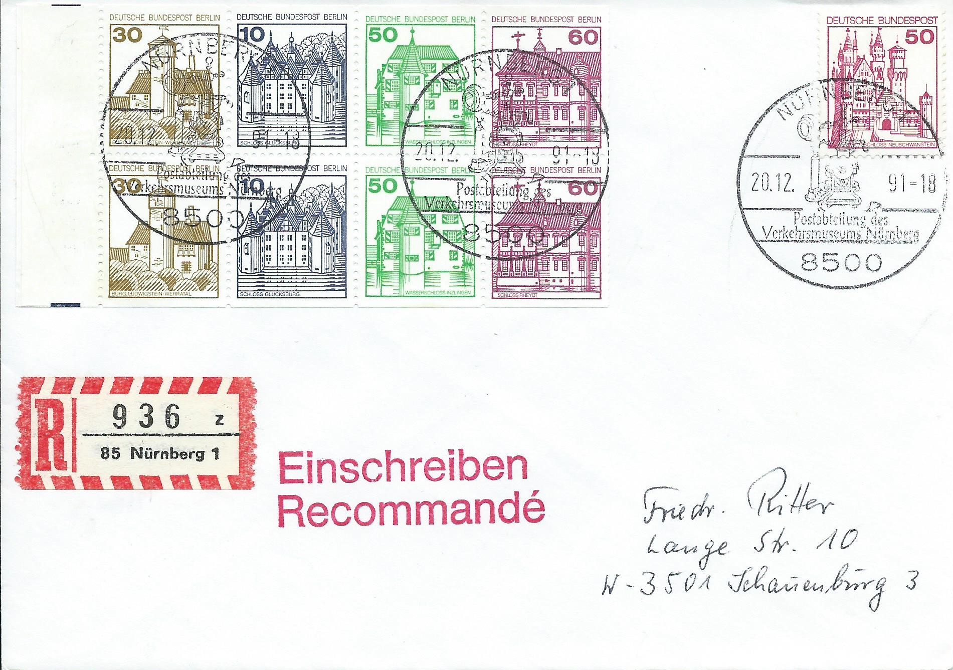 Den Anfang macht ein komplettes Heftchenblatt (sogar mit Rand!) auf einem Einschreibbrief mit einer Zusatzfrankatur einer Marke Burgen und Schlösser 50 Pf. Gestempelt wurde mit einem Sonderstempel aus Nürnberg am 20.12.91.