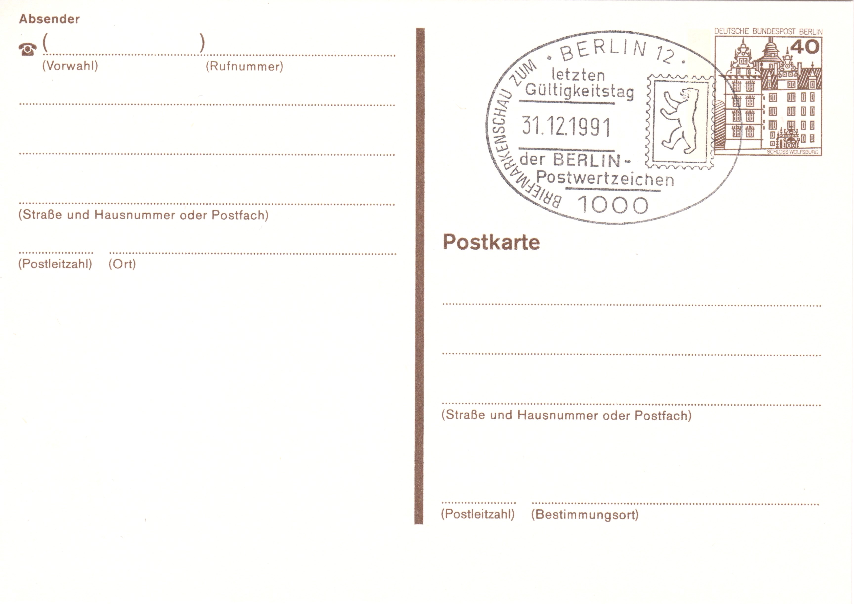 Am 31.12.1991 als letztem Gültigkeitstag gefälligkeitsgestempelte Postkarte zu 40 Pf: