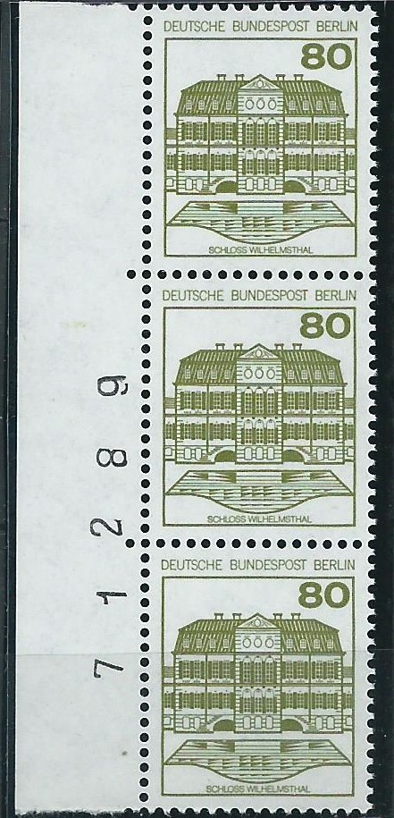 Der Wert zu 80 Pf vom linken Bogenrand als senkrechter 3-er-Streifen mit Bogenzählnummer auf einem Briefausschnitt, gestempelt mit einem Sonderstempel von Frankfurt am Main vom 22.3.81: