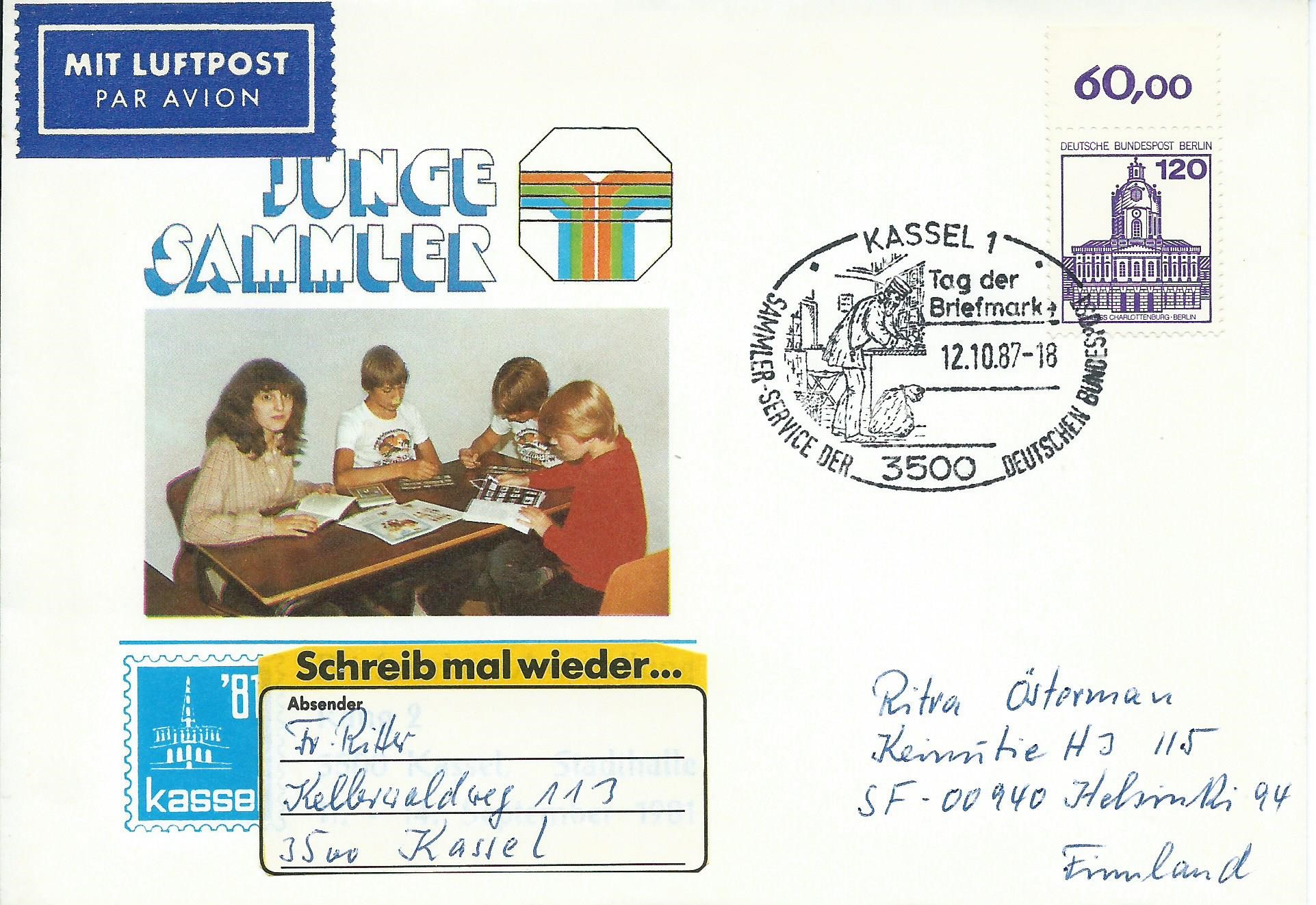 Der Wert zu 120 Pf vom linken Bogenrand als senkrechter 3-er-Streifen mit Bogenzählnummer auf einem Briefausschnitt, gestempelt mit einem Sonderstempel von Frankfurt am Main vom 22.3.81: