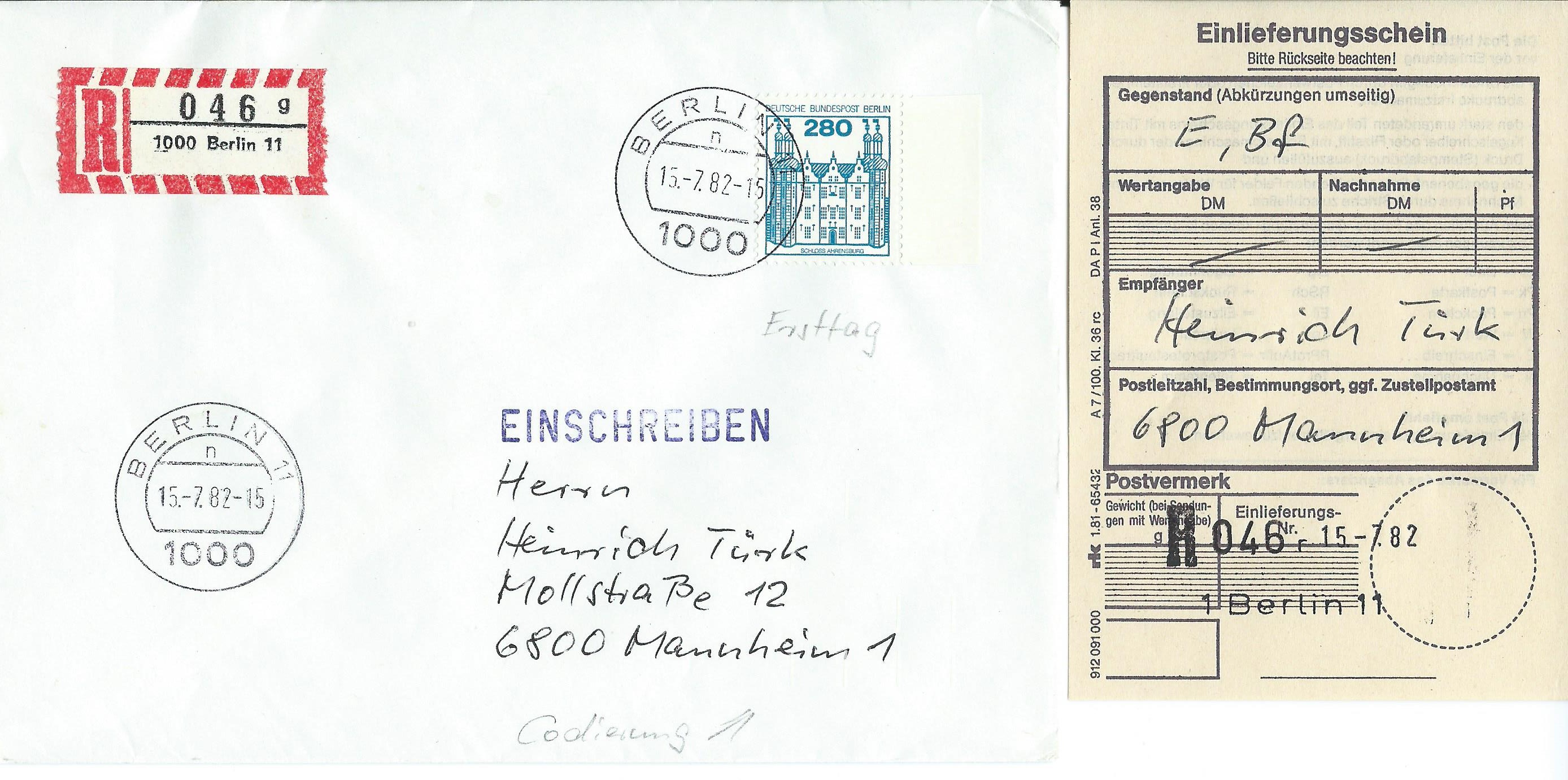 von der Marke zu 280 Pf habe ich noch 2 Belege im Bestand, die hier gerne gezeigt werden sollen. Zum einen ein Einschreiben mit einer Marke vom rechten Bogenrand als Frankatur. Gestempelt wurde am 15.7.82 in Berlin 11. Der Blick in den Katalog verrät uns, dass das Datum der Erstausgabetag war und wir somit einen Ersttagsbrief haben. Der ist auch sogar echt gelaufen, der Einlieferungsschein hierfür liegt mir ebenfalls vor.