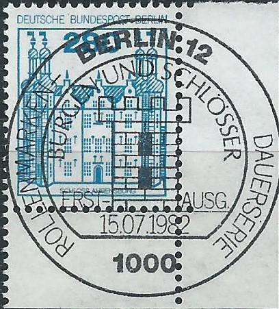 Der Wert zu 280 Pf aus der rechten unteren Bogenecke mit Ersttagssonderstempel Berlin 12 vom 15.7.82: