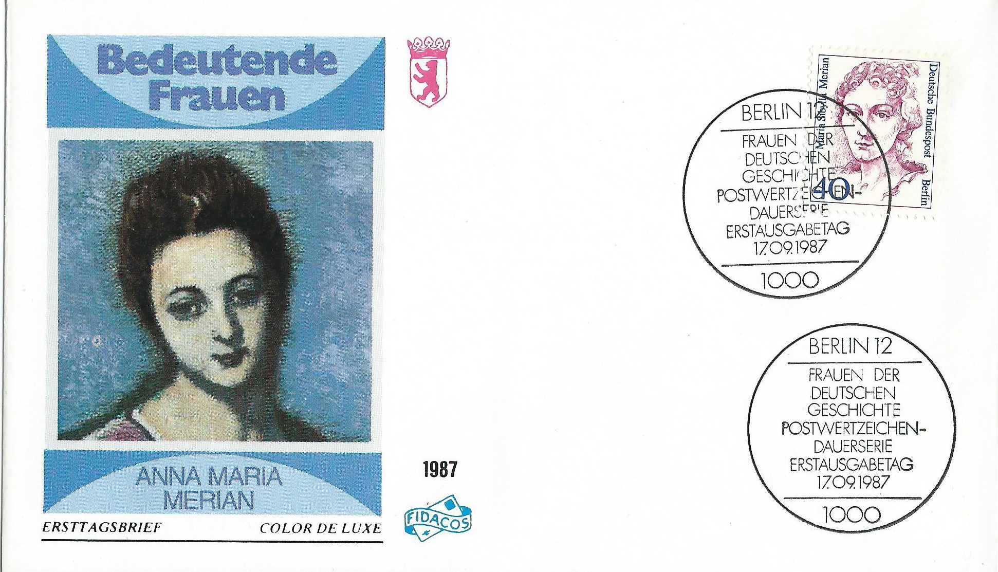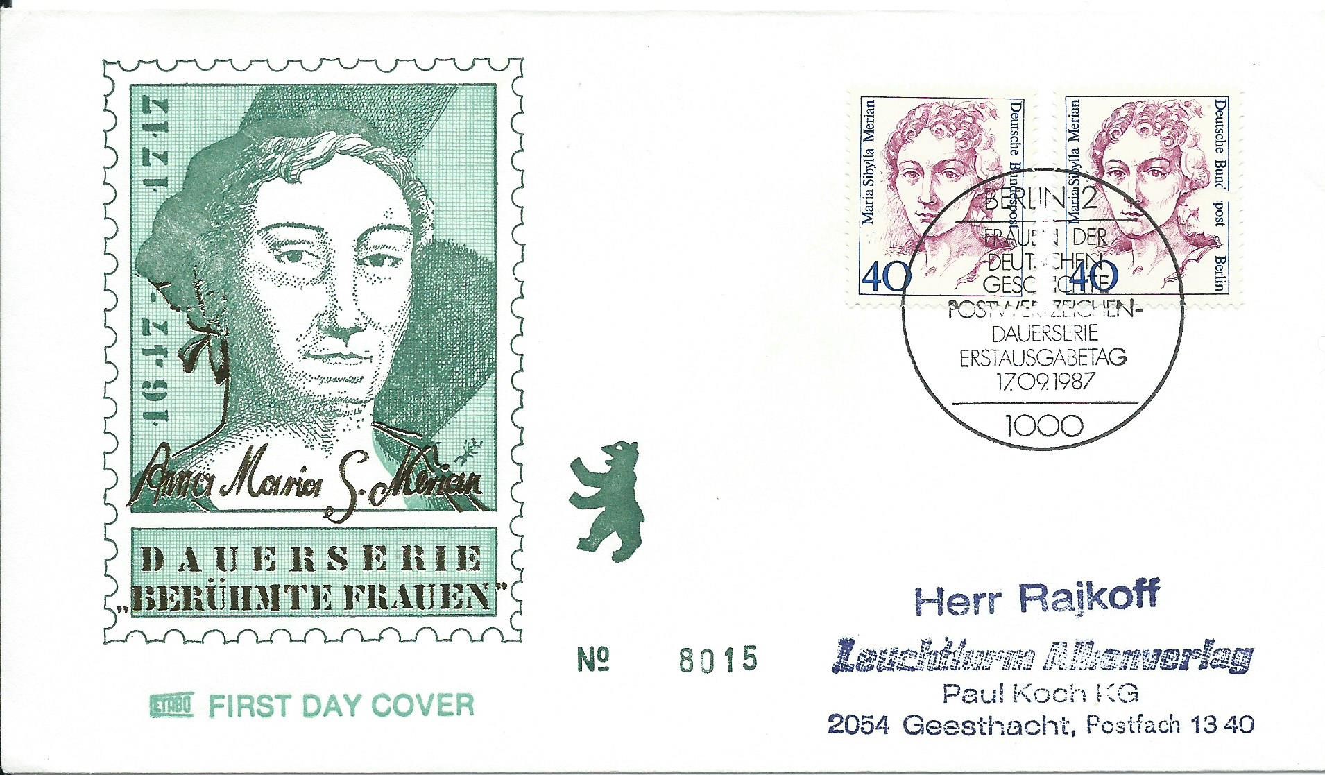 am 17.9.87 erschien die Marke der Dauerserie Frauen der Deutschen Geschichte mit der Wertstufe zu 40 Pf Maria Sibylla Merian. Hier wird sie auf einem Ersttagsbrief zusammen mit dem passenden Berliner Ersttagsstempel präsentiert: