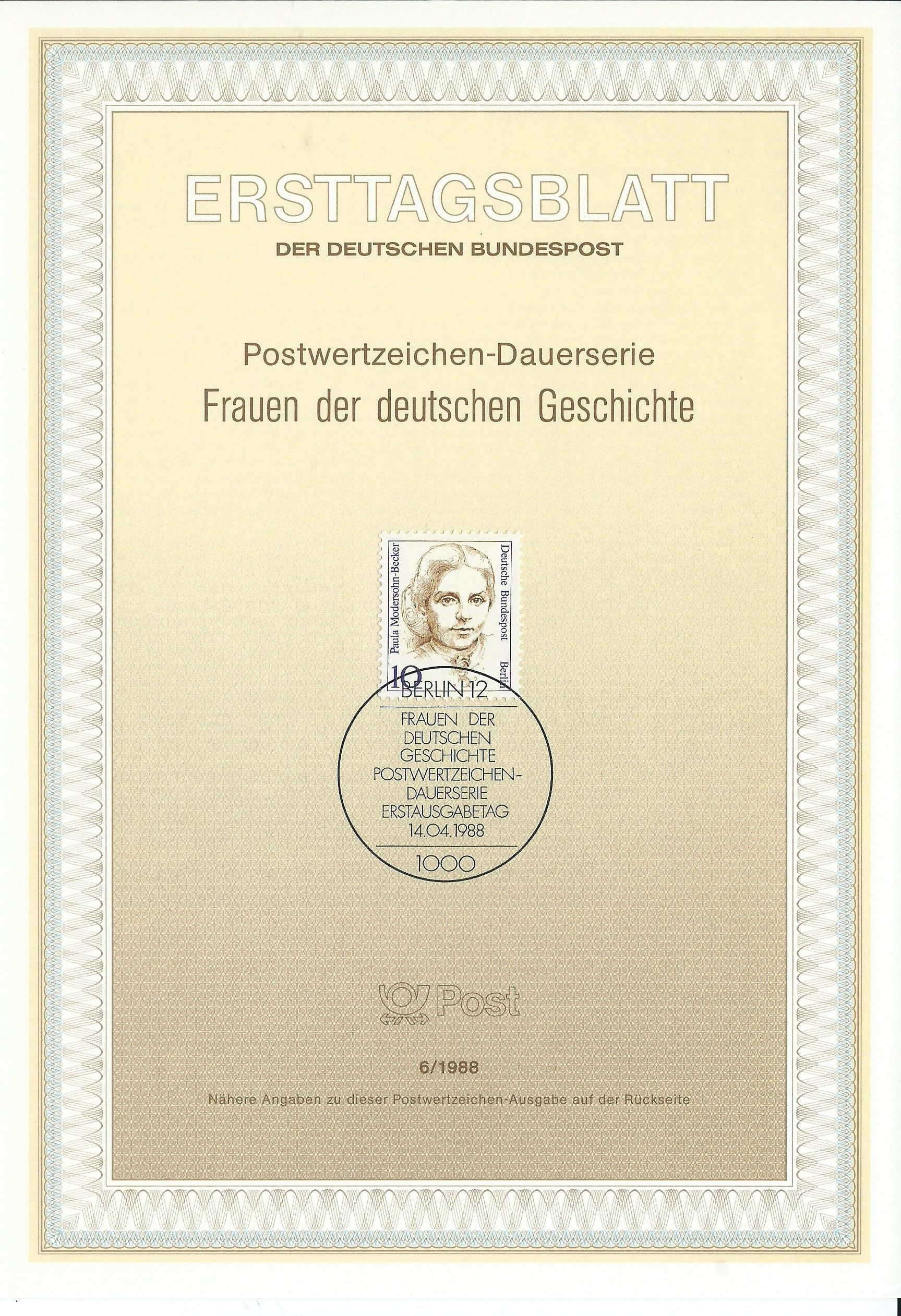 am 14.4.88 erschien die Marke der Dauerserie Frauen der Deutschen Geschichte mit der Wertstufe zu 10 Pf. Hier wird sie auf einem Ersttagsblatt zusammen mit dem passenden Berliner Ersttagsstempel präsentiert: