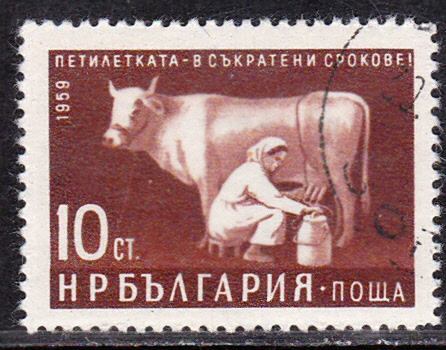 Diese Marke aus Bulgarien (MiNr 1235) zeigte eine Bäuerin mit Melkmaschine beim Melken.