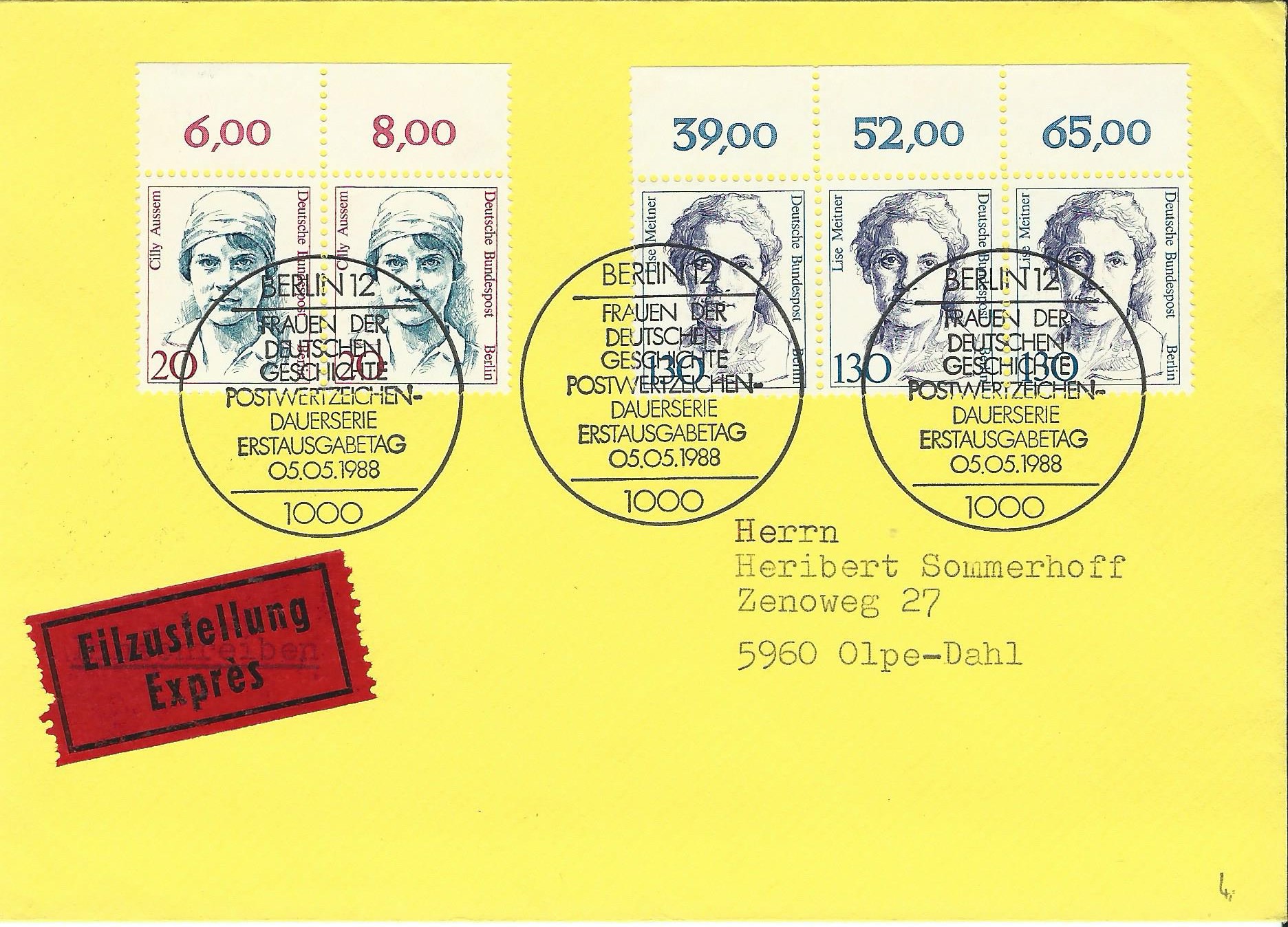 ein Ersttagsbrief der 20 Pf-Marke der besonderen Art: Ein 4-er-Block auf einem gelaufenen Brief der Portostufe 80 Pf, am 5.5.88 mit dem passenden Berliner Ersttagsstempel entwertet.