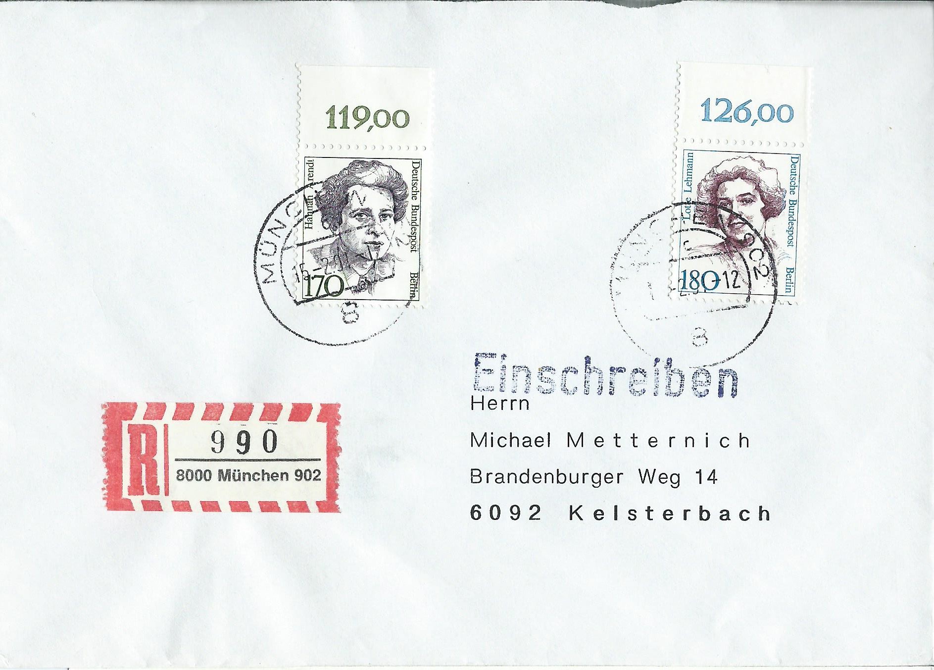 hier habe ich einen Beleg mit einer Frankatur der Marken der Frauenserie Berlin zu 170 und 180 Pf jeweils vom Oberrand mit Reihenwertzähler 119,00 und 126,00. Er ist korrekt mit 3,50 DM für ein Einschreiben frankiert. Gestempelt wurde er am 15.2.91 in München