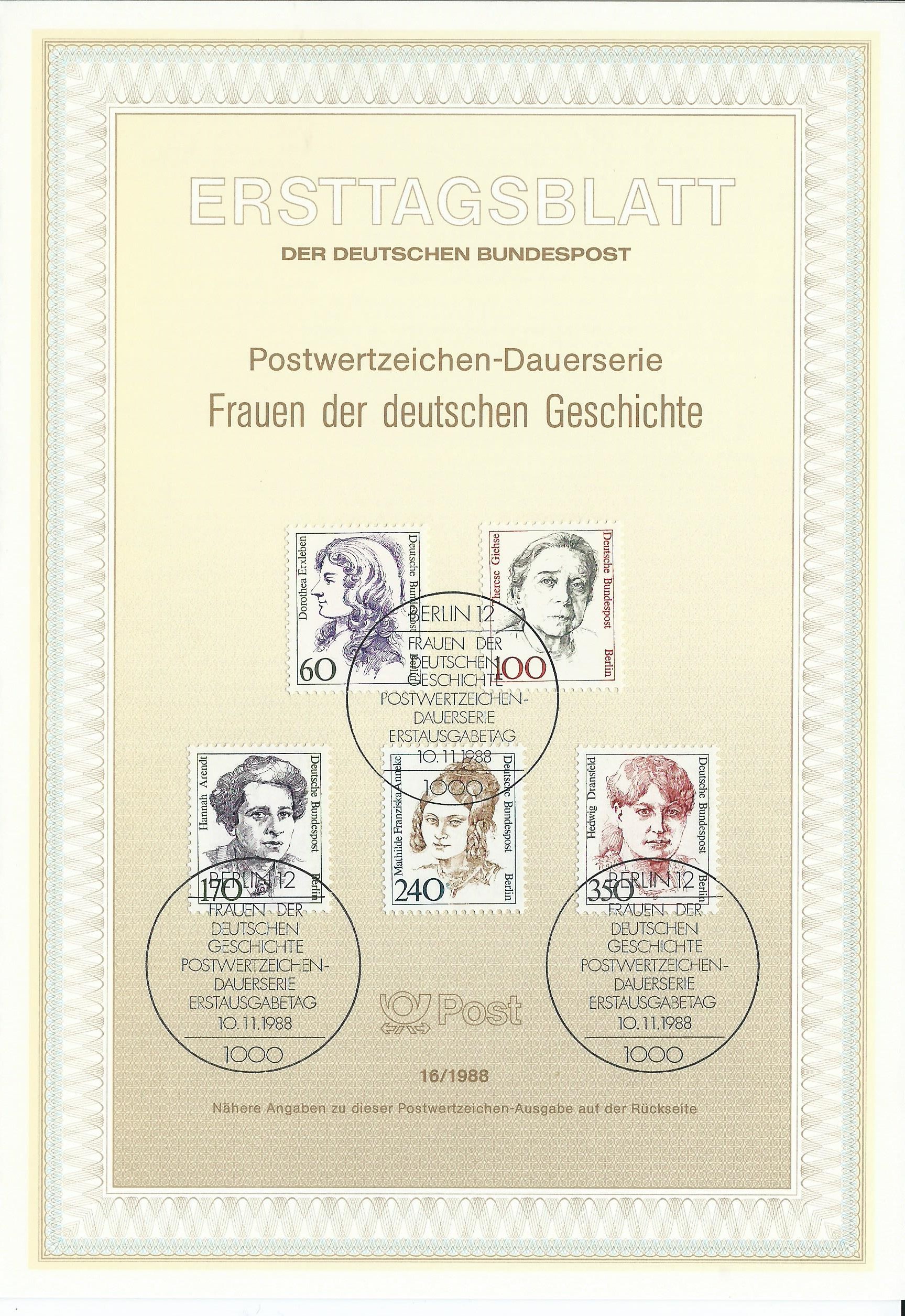 am 10.11.88 erschienen die Marken der Dauerserie Frauen der Deutschen Geschichte mit den Wertstufen zu 60, 100, 170, 240 und 350 Pf. Hier werden sie auf einem Ersttagsblatt zusammen mit dem passenden Berliner Ersttagsstempel präsentiert: