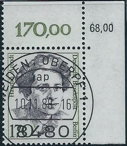 hier kann ich eine Marke der Serie „Frauen“ zu 170 Pf zeigen, die aus der rechten oberen Bogenecke stammt. Gestempelt wurde mit dem Klischeestempel Weiden am 10.11.88. In der äußeren Ecke ist noch der korrigierte Bogenwertzähler 68,00 mit aufgedruckt.