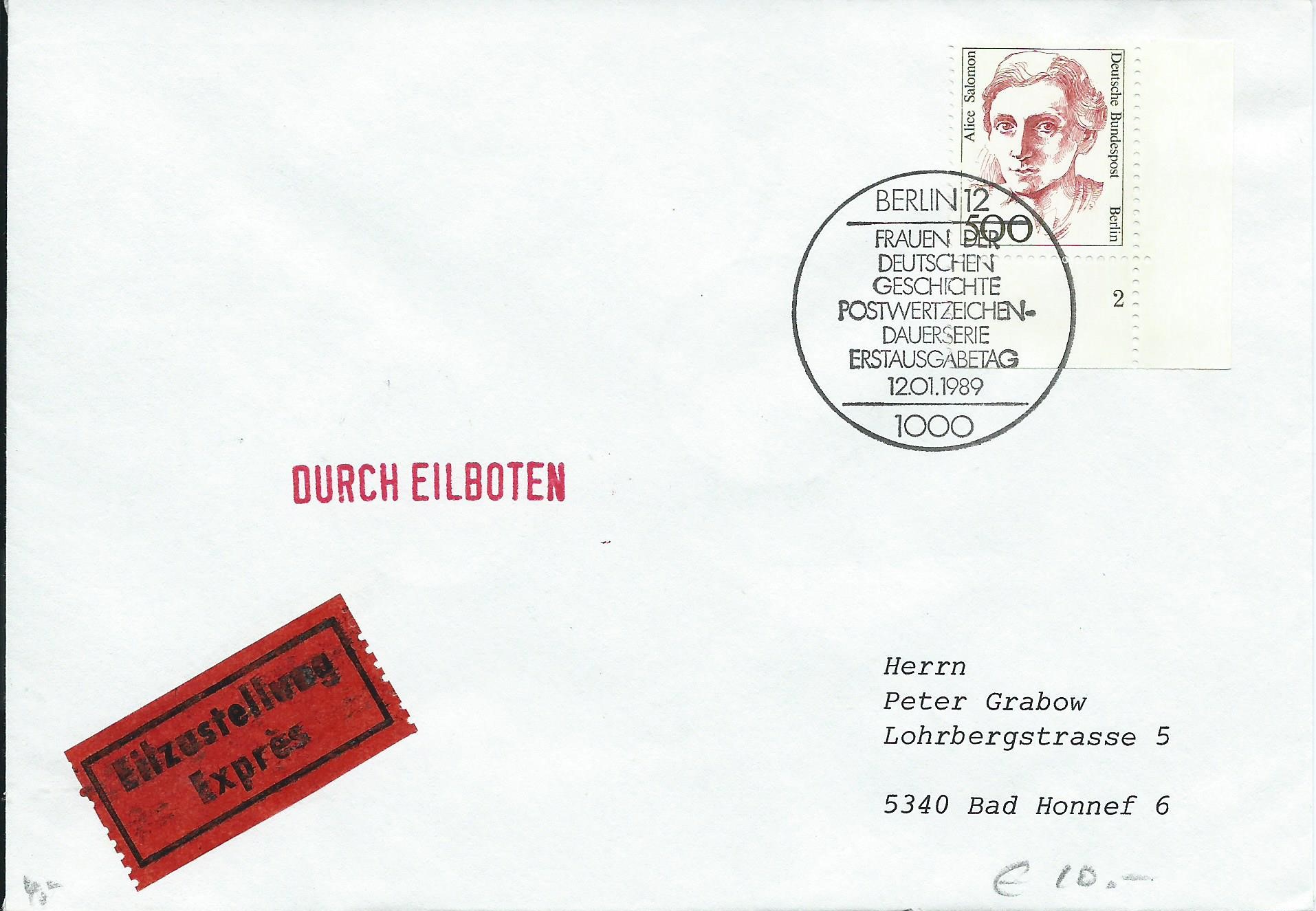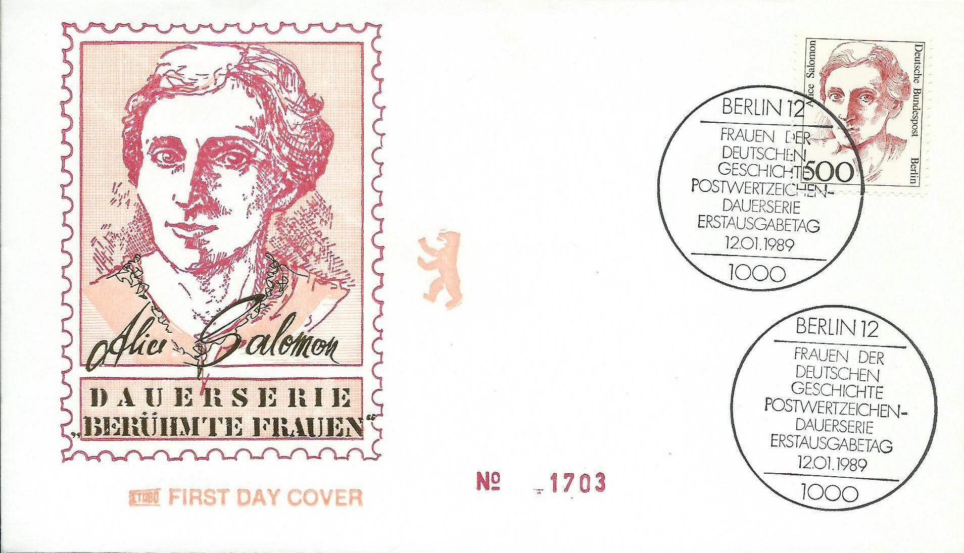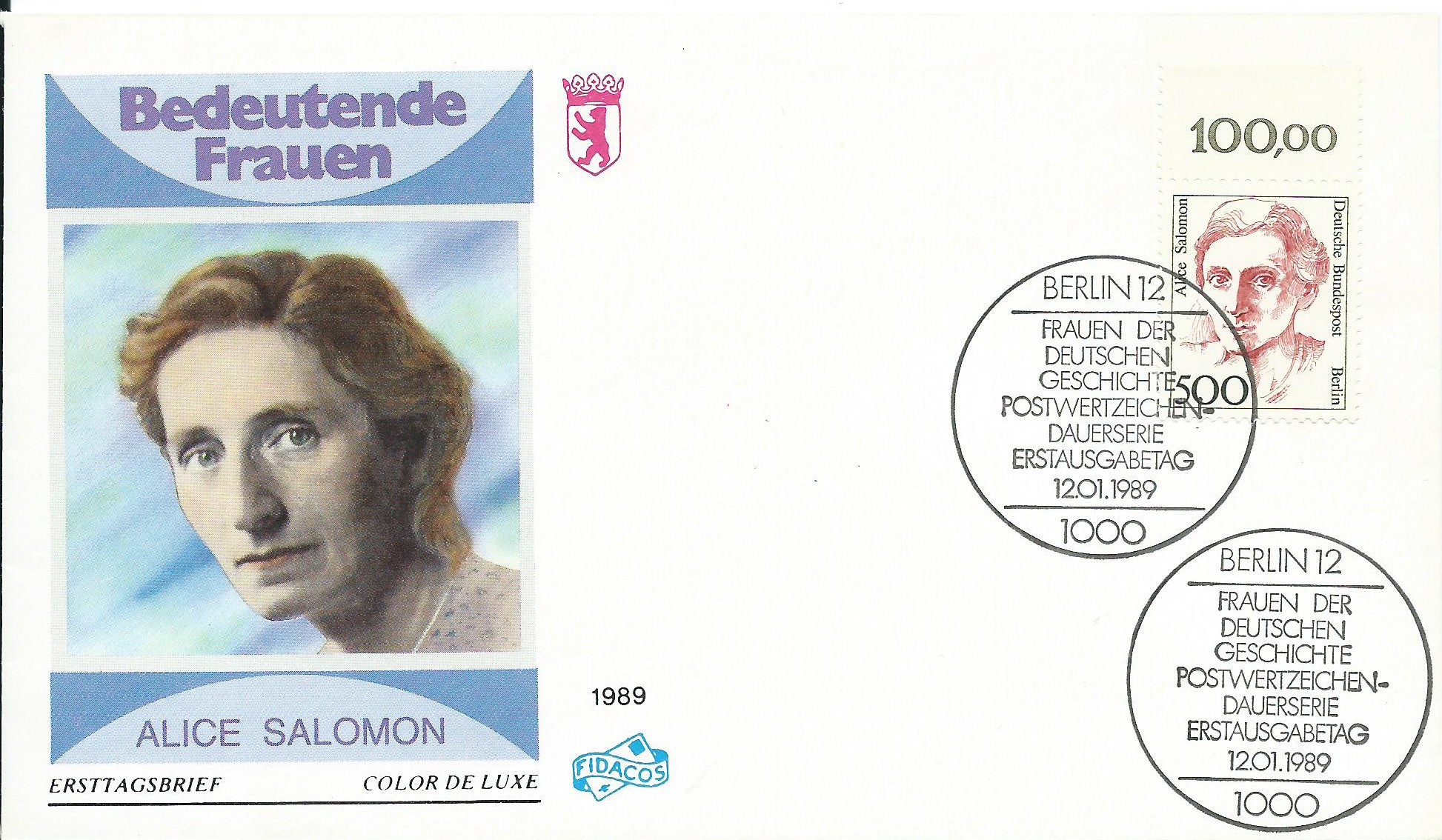 am 12.1.89 erschien die Marke der Dauerserie Frauen der Deutschen Geschichte mit der Wertstufe zu 500 Pf Alice Salomon. Hier wird sie auf einem Ersttagsbrief zusammen mit dem passenden Berliner Ersttagsstempel präsentiert: