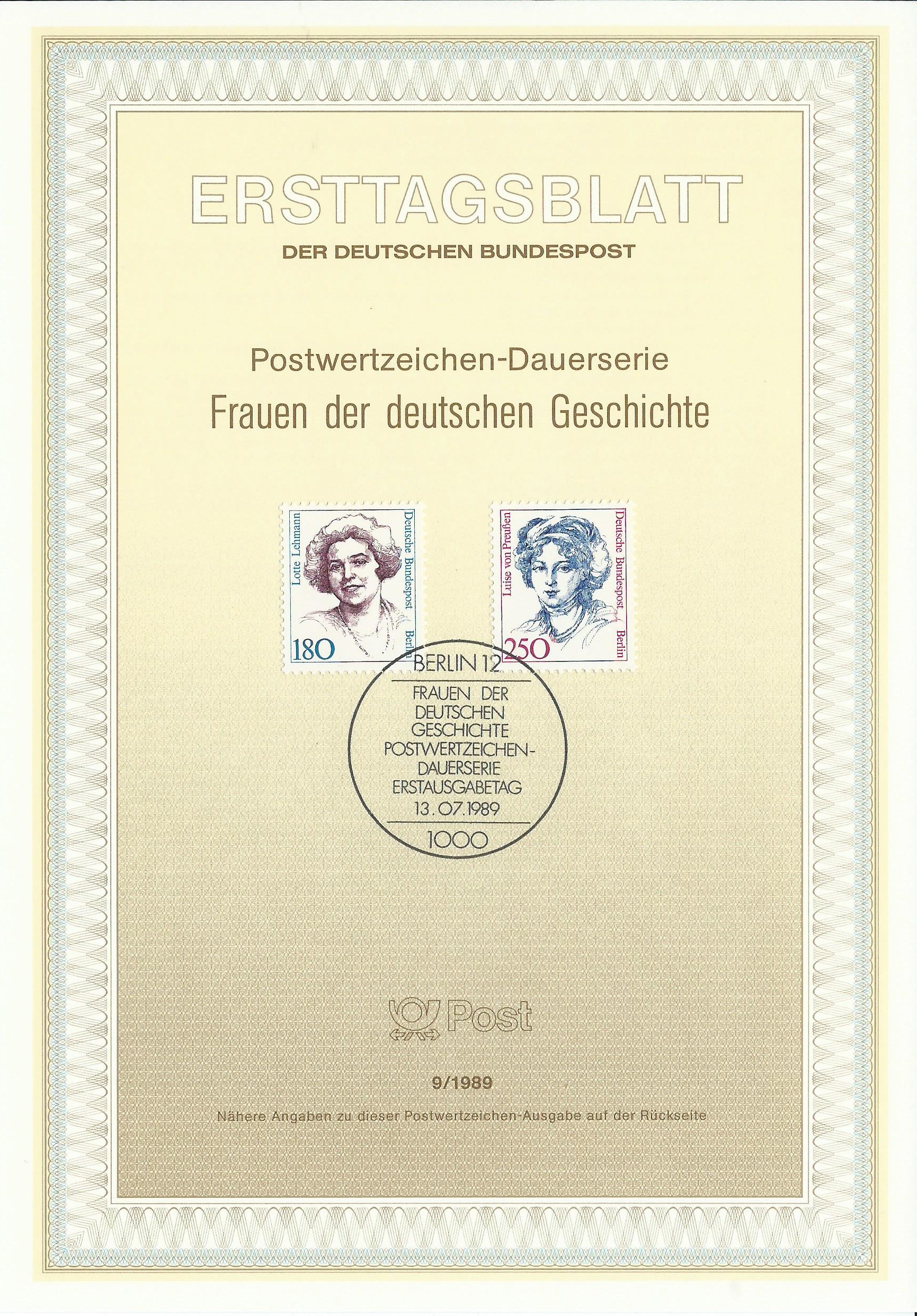 am 13.7.89 erschienen die Marken der Dauerserie Frauen der Deutschen Geschichte mit den Wertstufen zu 180 und 250 Pf. Hier werden sie auf einem Ersttagsblatt zusammen mit dem passenden Berliner Ersttagsstempel präsentiert: