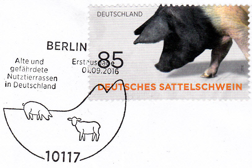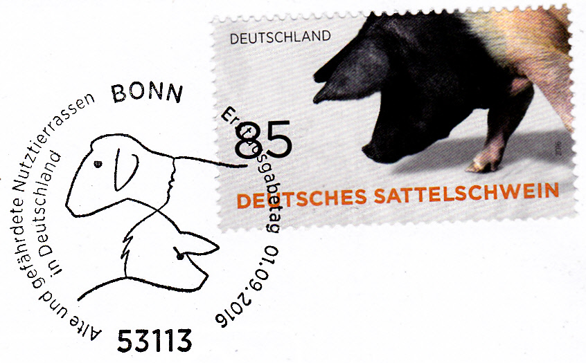 Das Deutsche Sattelschwein ist eine Rasse des Hausschweins und die gefährdete Nutztierrasse des Jahres 2006. Das Tier hat seinen Namen von seiner Färbung: Die schwarze Grundfarbe wird in der Mitte von einem hellen "Sattel" unterbrochen. Auf dieser Marke der Deutschen Post AG (MiNr 3261) ist ein Deutsches Sattelschwein zu sehen.