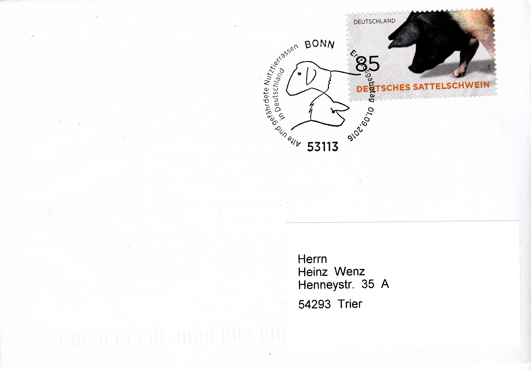 Die Marke zu 85 Cent aus dem Block wurde hier auf einem Brief mit dem Ersttagsonderstempel Bonn gestempelt. Im Stempelbild sind ein Schaff und ein Schwein zu sehen.